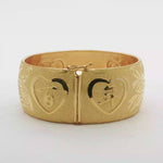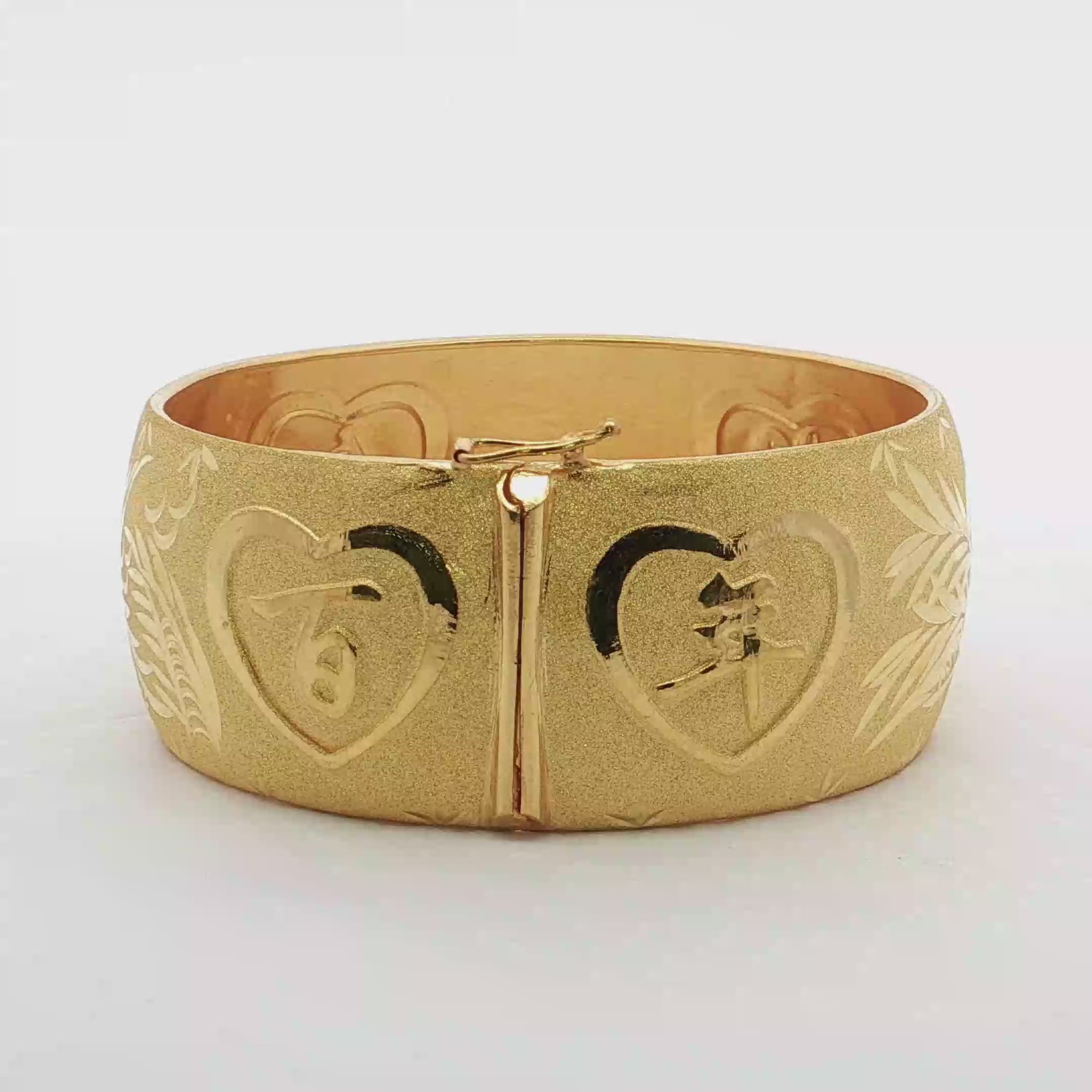 這款精美的黃金手鐲,採用傳統中式設計,鐲身飾有精緻的花卉圖案和寓意吉祥的文字,展現了古典文化的韻味。手鐲以優質黃金打造,色澤亮麗,質地細膩,佩戴舒適,是日常穿搭或特殊場合的理想選擇,為您的造型增添一份優雅與祝福。