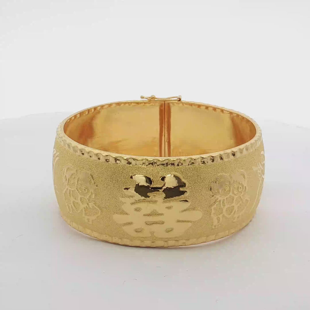 這款精美的足金手鐲,以其飽滿的黃金色澤與精緻的圖騰紋飾,展現出傳統文化的優雅魅力。鐲身表面經特殊工藝處理,呈現出細膩的磨砂質感,觸感舒適。整體設計簡約大方,是日常搭配或特殊場合的理想之選,為您的造型增添一份高貴氣息。