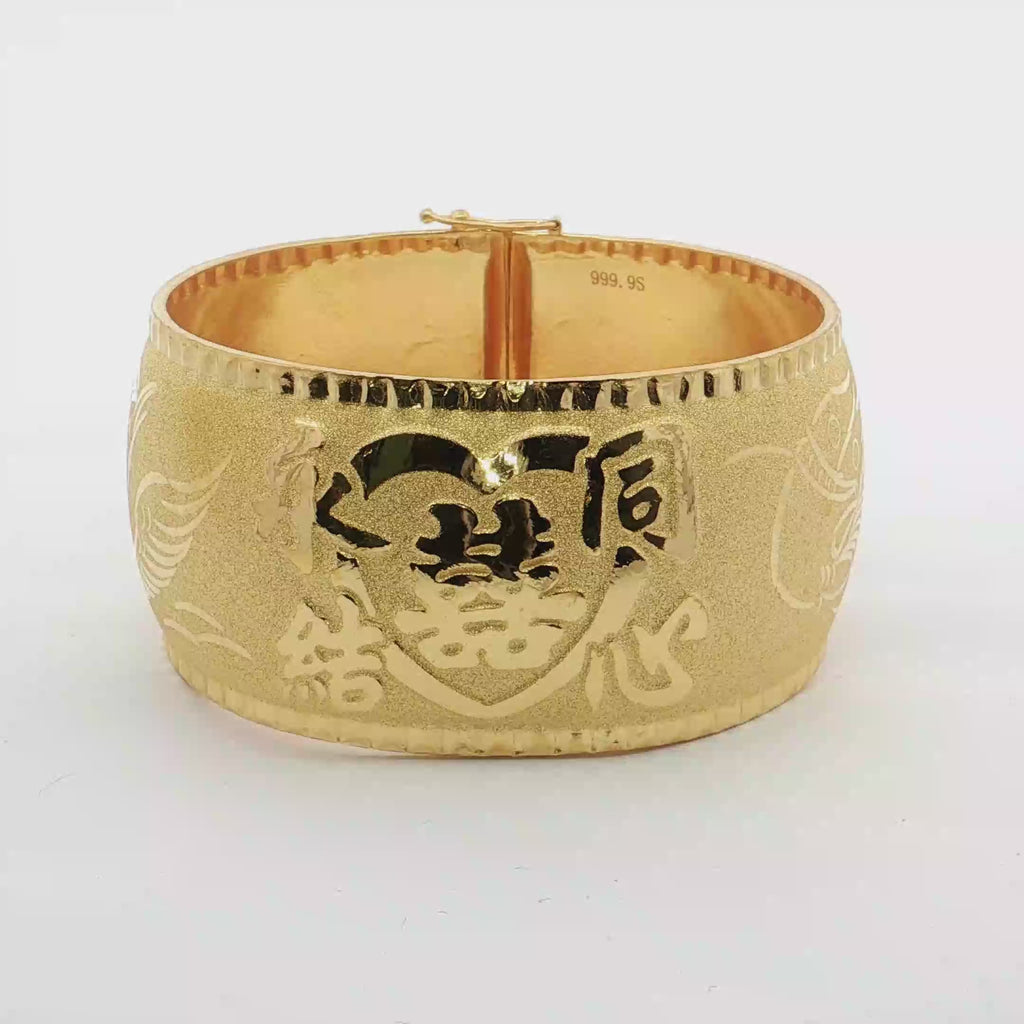 這款設計精美的黃金手鐲,採用精湛的工藝打造,呈現出耀眼奪目的光澤。鐲身刻有傳統吉祥圖案與文字,寓意著美好的祝願與永恆的幸福。適合在重要場合佩戴,展現佩戴者高貴典雅的品味,是傳承經典的完美之選。