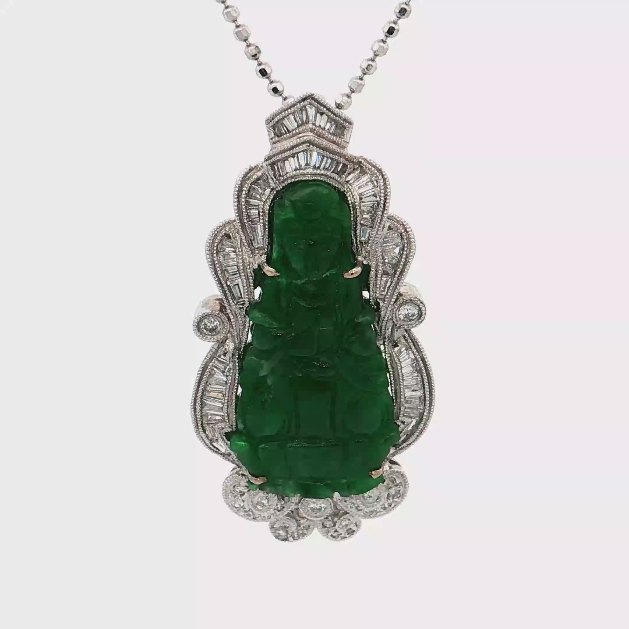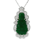 吊墜主石為雕刻精美的翡翠,呈現濃郁的綠色,散發著神秘而迷人的光彩。翡翠的雕工精湛,線條流暢,為整體設計增添了藝術氣息。這款項鍊不僅是美麗的裝飾品,更是一件具有收藏價值的藝術品,適合追求品味與獨特風格的您。