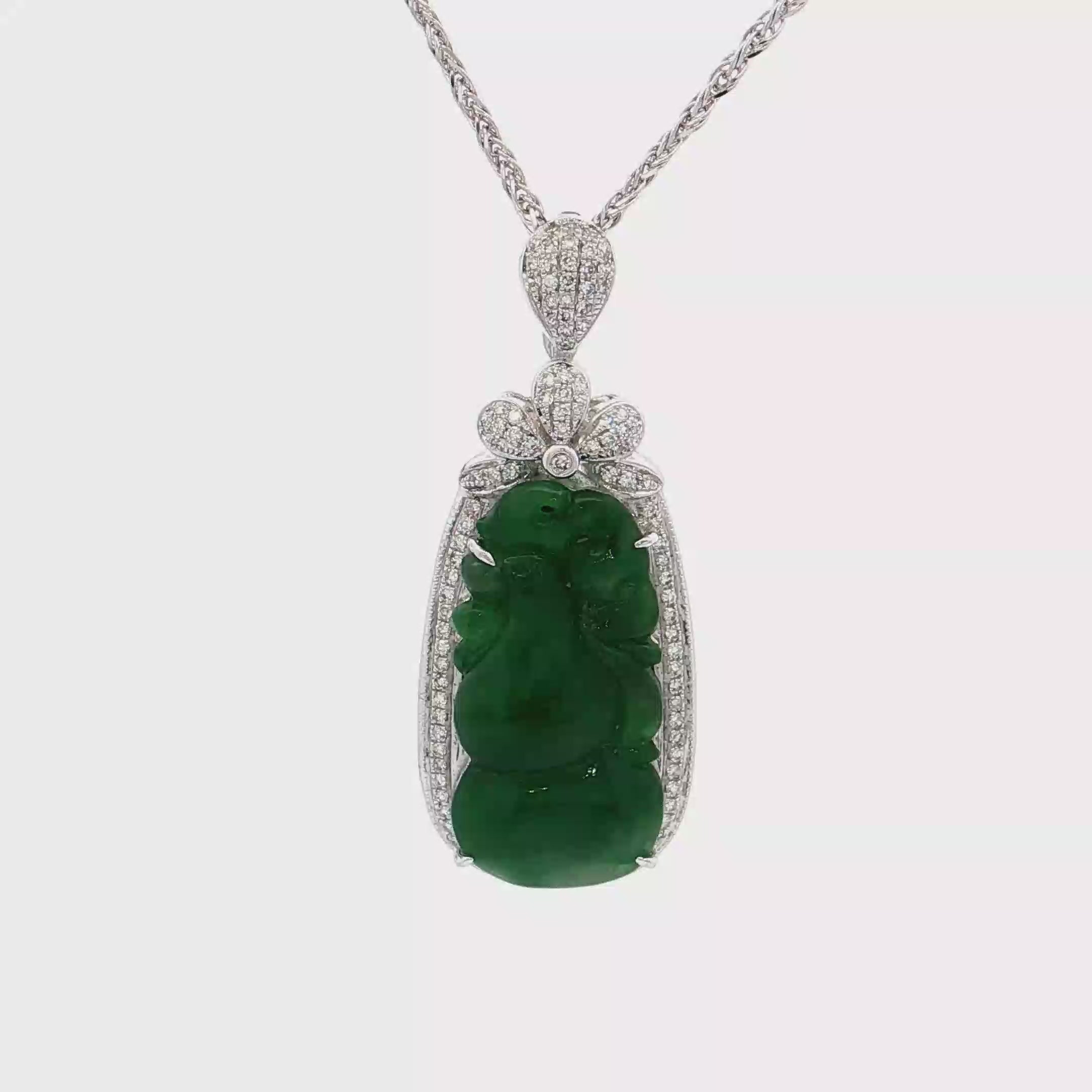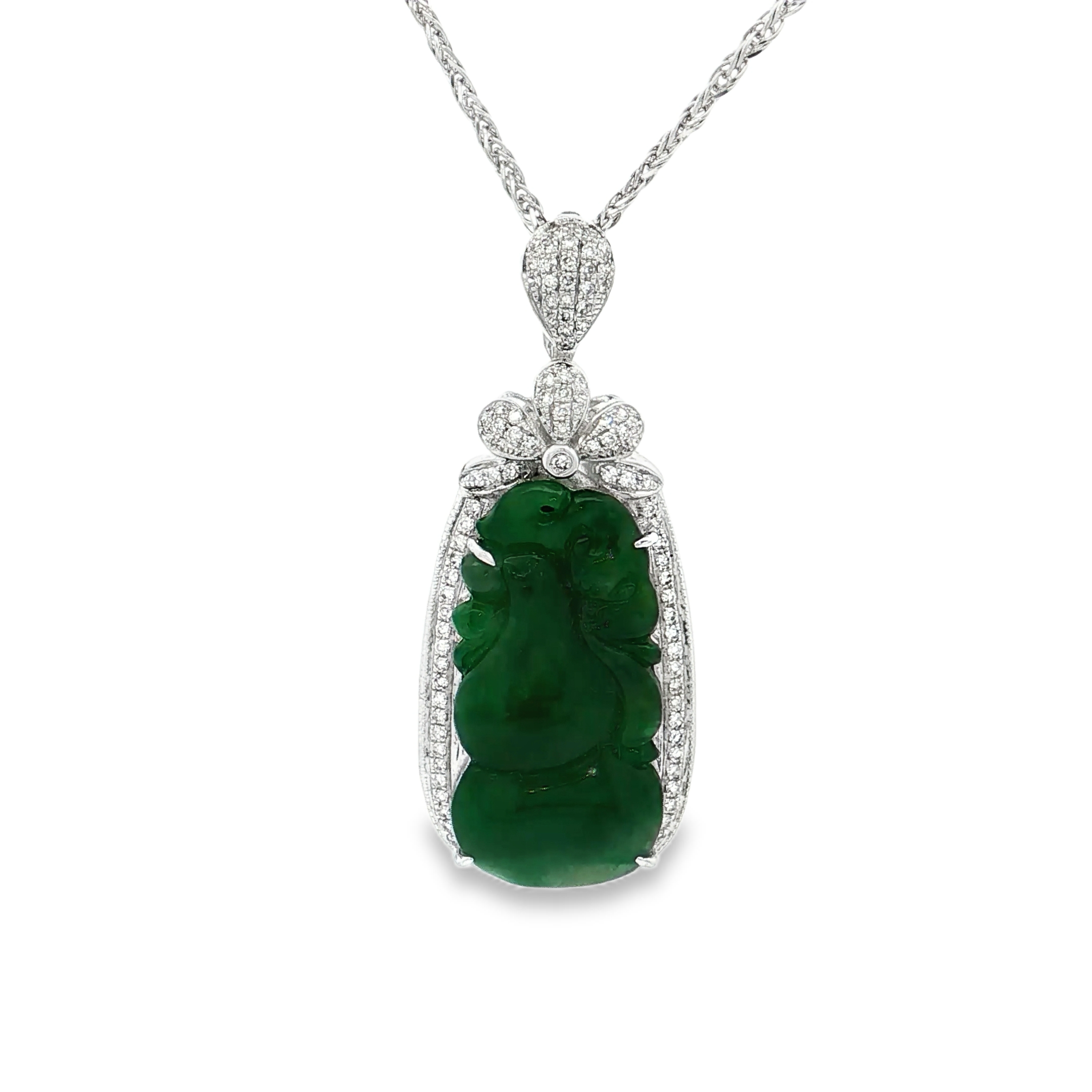 吊墜主體鑲嵌著精雕細琢的翡翠,翠色欲滴,造型飽滿,散發著東方韻味。翡翠的雕刻工藝精湛,線條流暢,更顯其珍貴與獨特。整體設計巧妙融合了傳統與現代元素,適合各種場合佩戴,盡顯佩戴者的高雅品味。