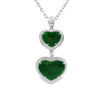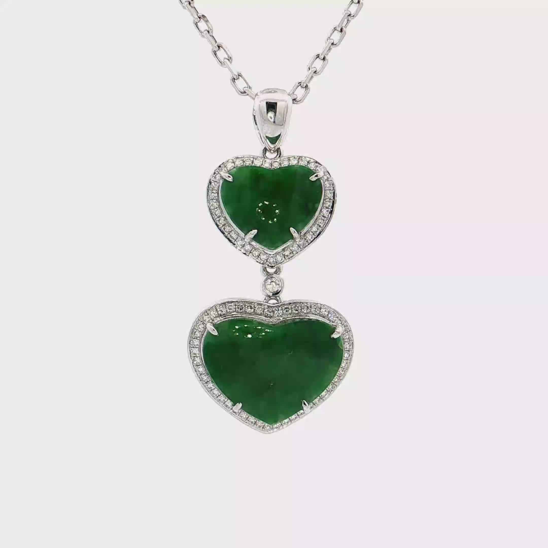 吊墜主石為兩顆心形翡翠,切割成圓潤的凸面,呈現出深邃的綠色光澤,寓意著愛意滿滿。整體設計簡約大方,適合日常佩戴,為您的造型增添一抹東方韻味。