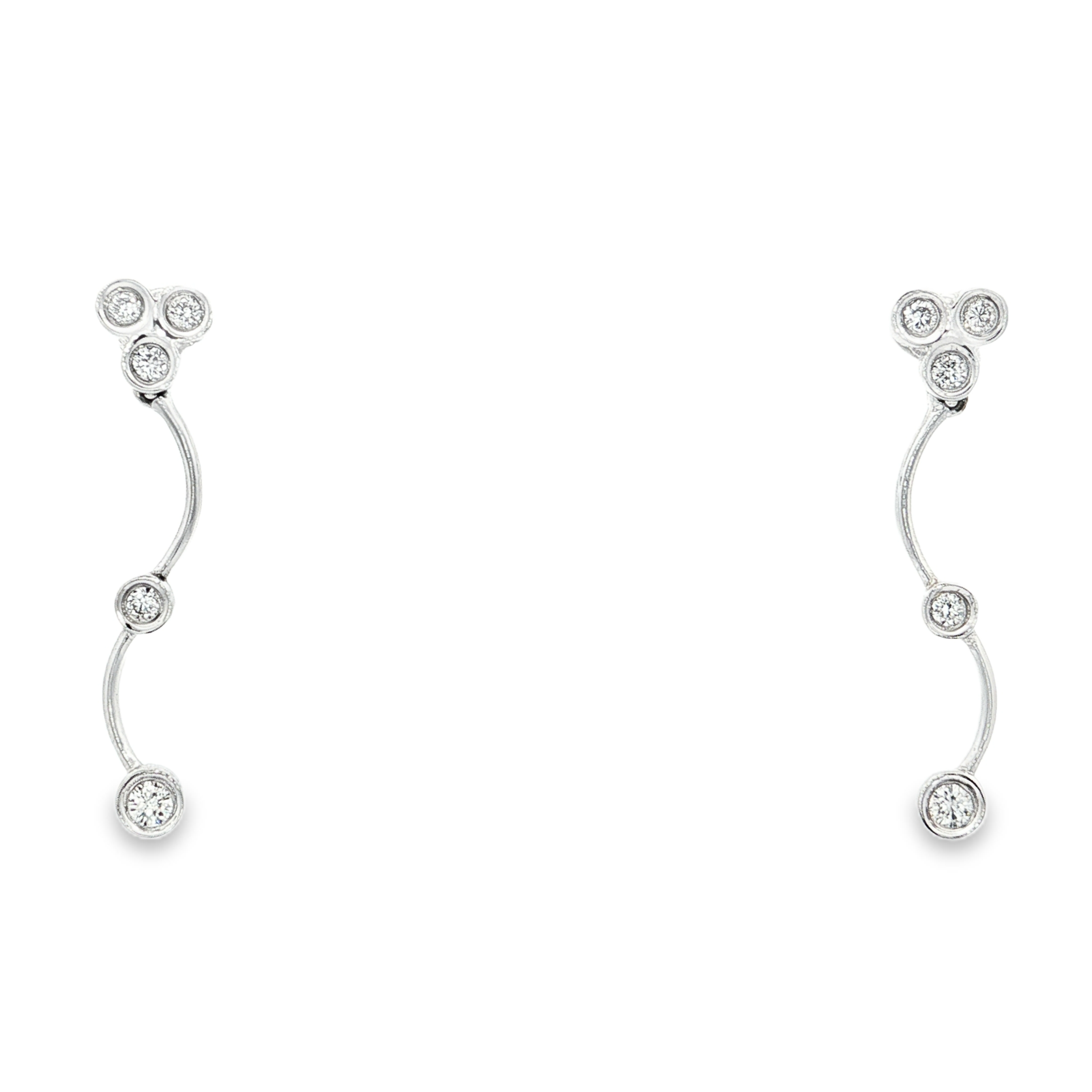 這款精緻的垂墜耳環以優雅的銀為基底,搭配閃耀的圓形明亮式切割鑽石,呈現出簡約而現代的美感。鑽石以精巧的排列點綴,增添了耳環的靈動感和光彩,適合各種場合佩戴,為您的造型增添一抹精緻的光芒。