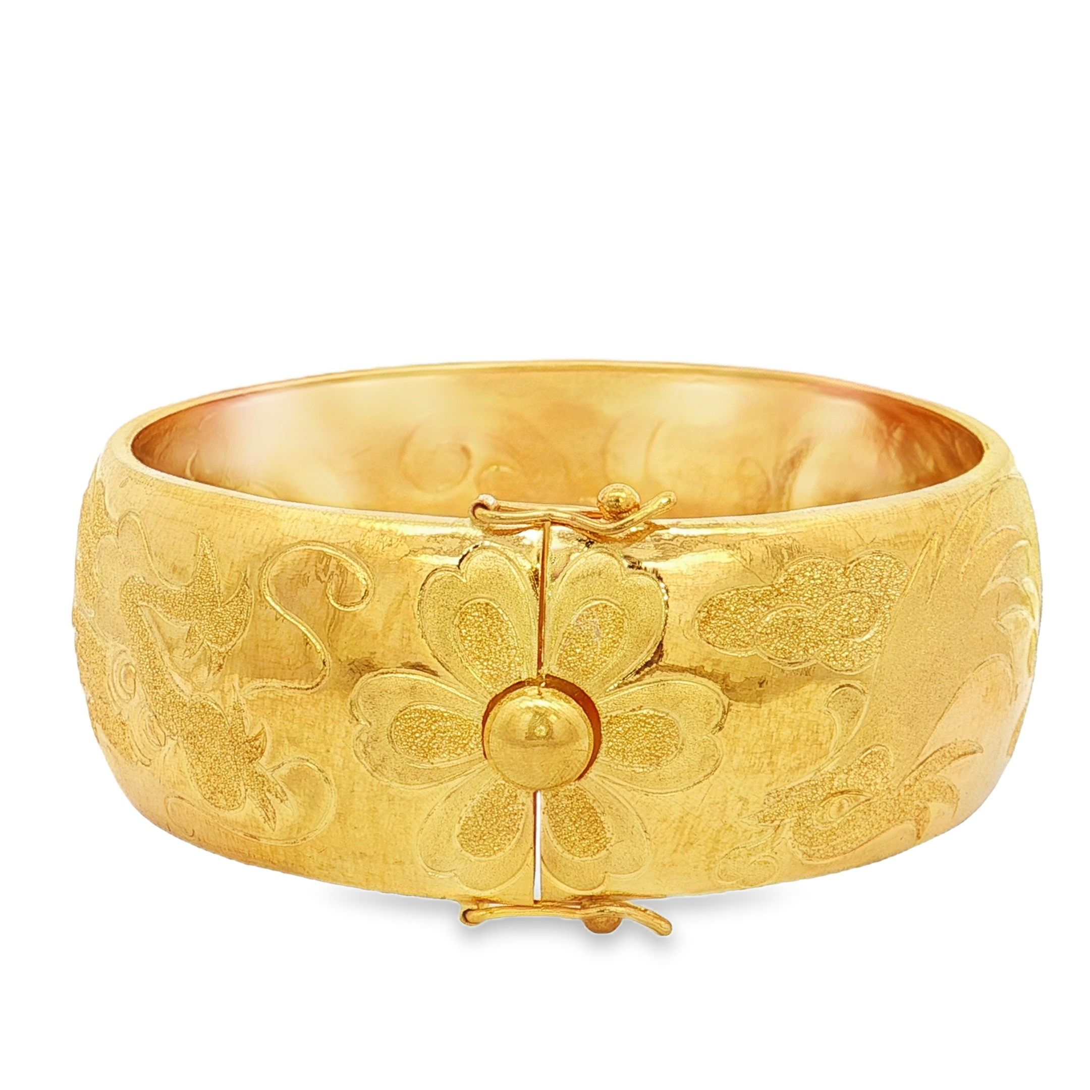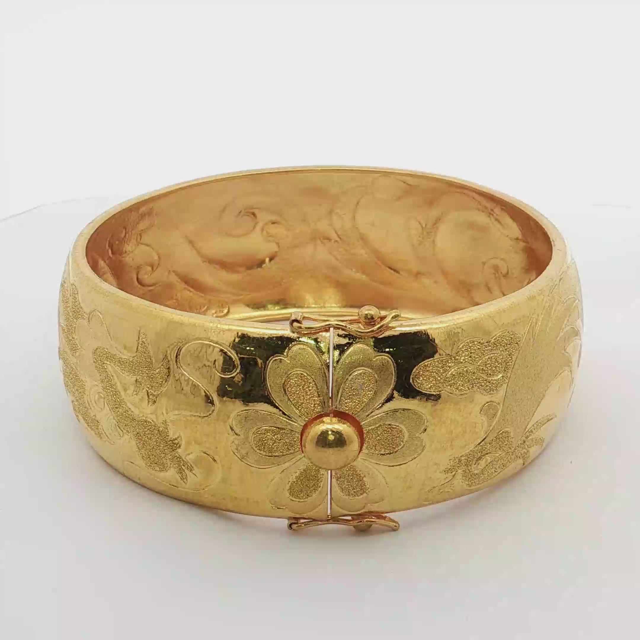 這款精緻的黃金手鐲,以其獨特的雕花設計和亮麗的黃金光澤,展現了傳統工藝的精湛與現代審美。手鐲的寬厚設計,使其佩戴舒適且引人注目。適合日常佩戴,也為特殊場合增添一份優雅氣息。