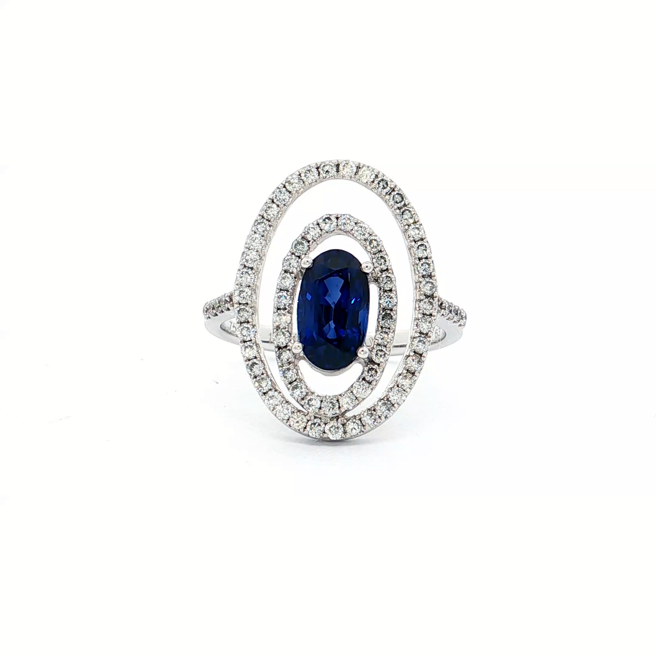 戒指中央鑲嵌一顆深藍色凸面橢圓形藍寶石,其深邃的色澤與獨特的切割工藝相得益彰。整體設計簡約而不失奢華,適合在各種場合佩戴,展現您的獨特品味與魅力。