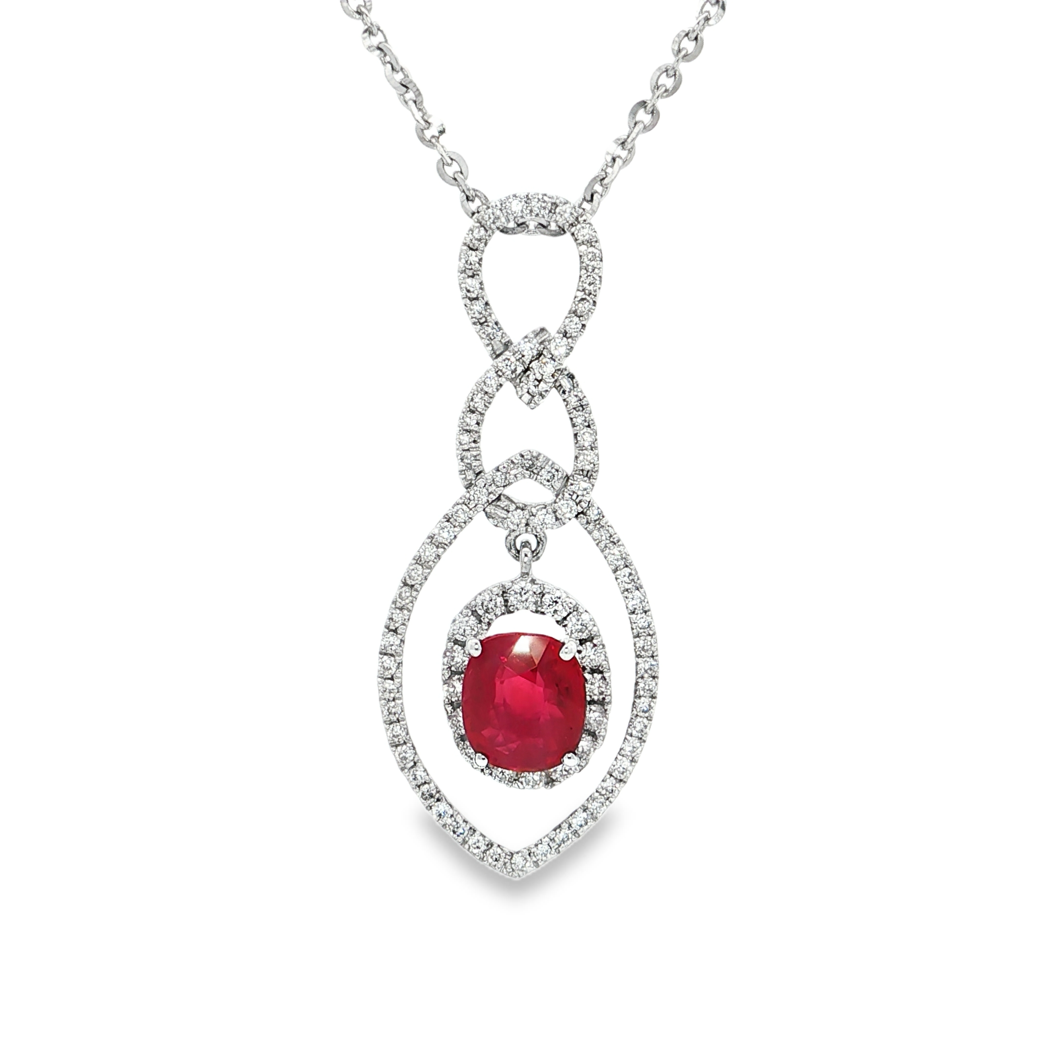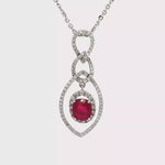 項鍊中央鑲嵌一顆圓形凸面切割的紅寶石,色澤濃郁鮮明,散發紅色光芒。璀璨的圓形明亮式切割鑽石環繞紅寶石,更顯其華麗。吊墜設計精巧,線條流暢,垂直懸掛時呈現完美平衡,是一款能展現個人品味的精緻配飾。
