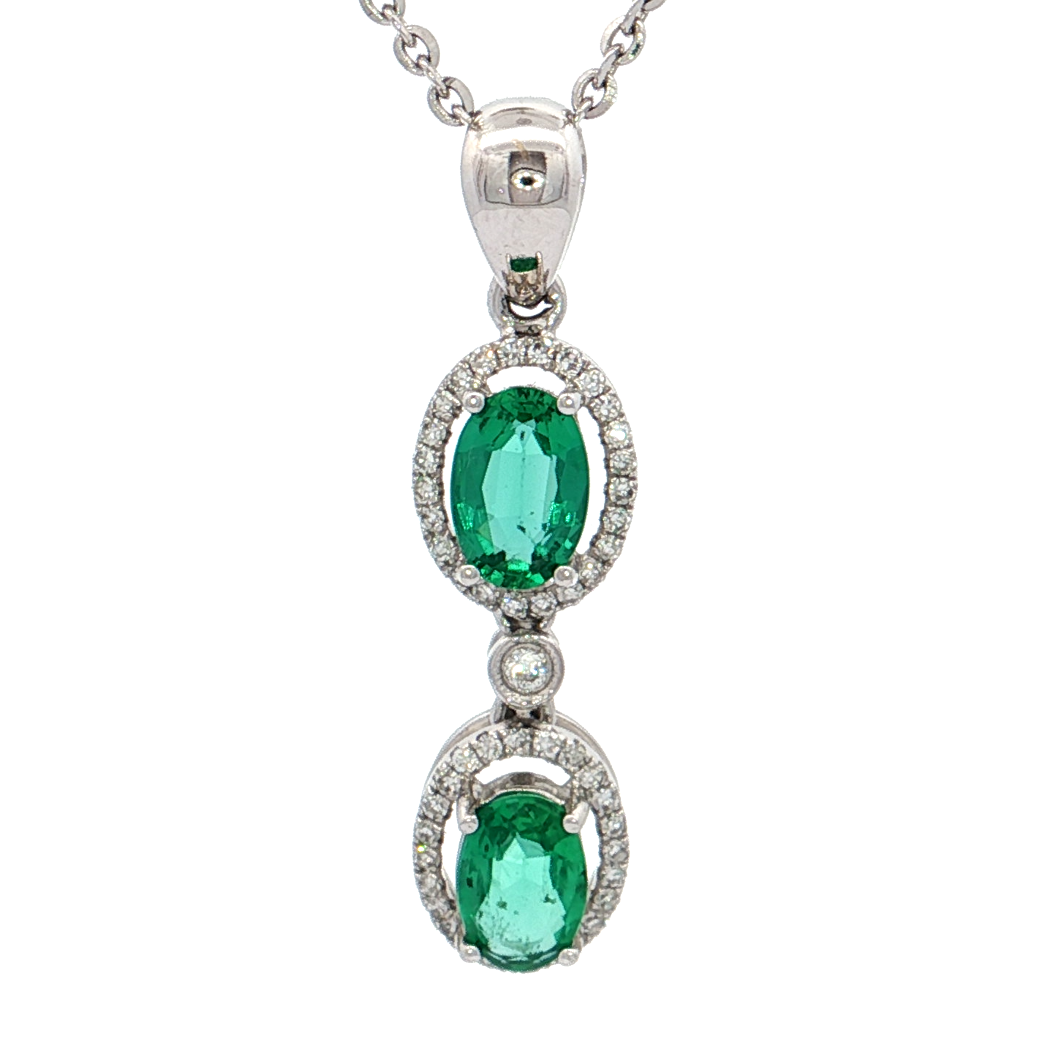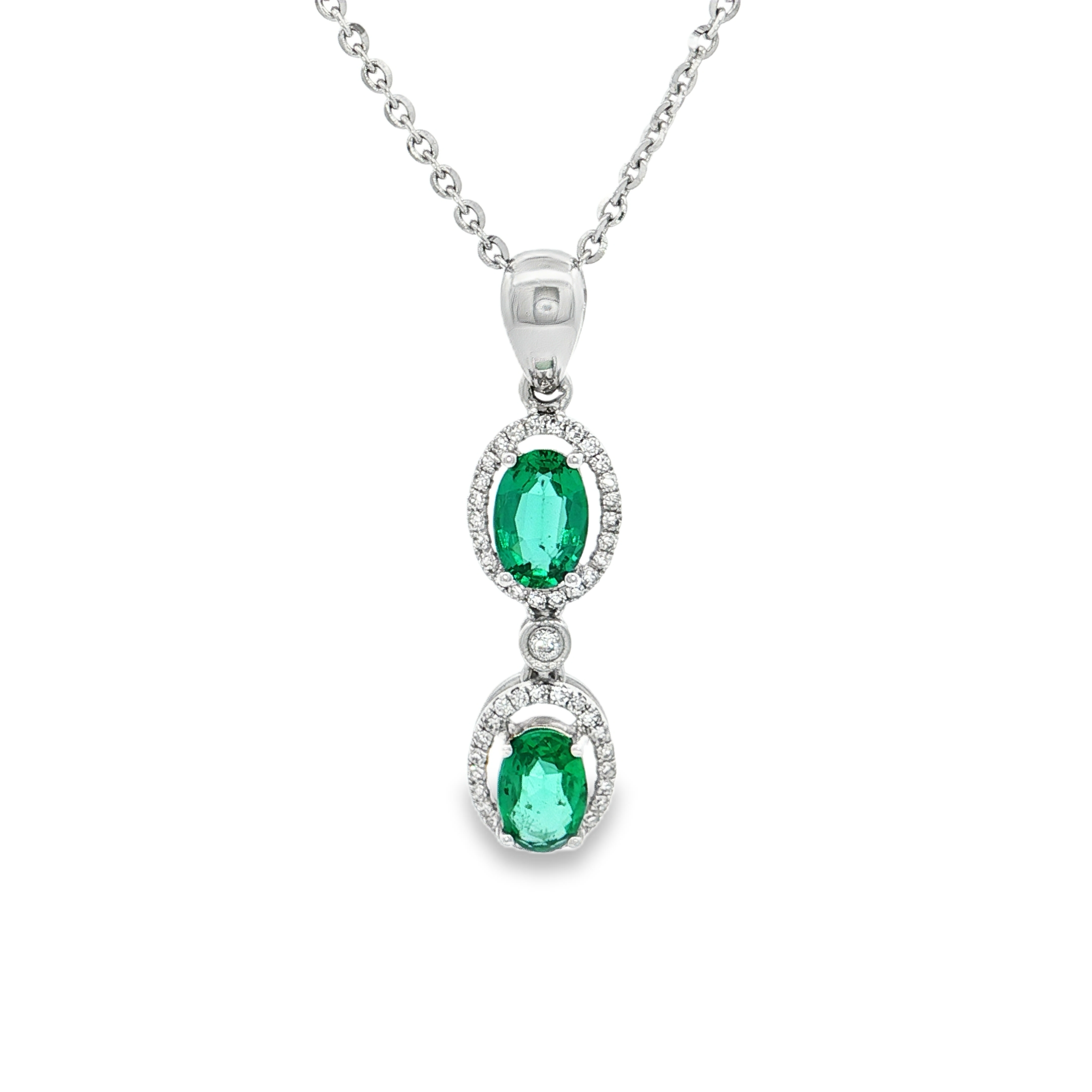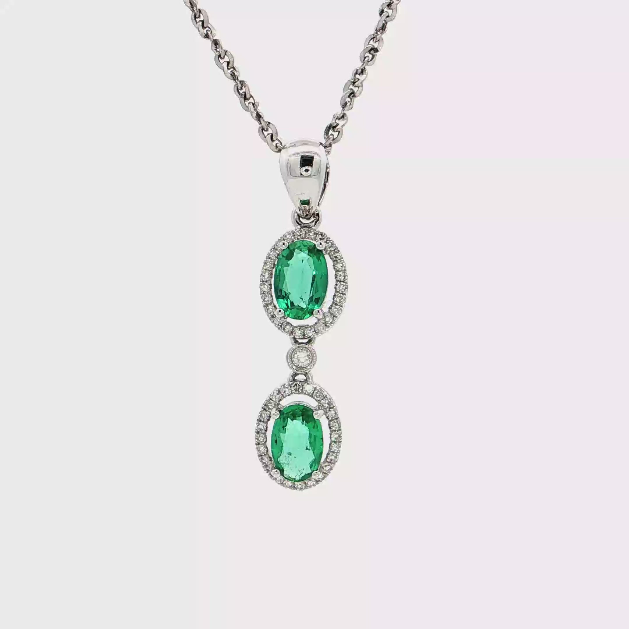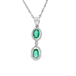 這款精緻的鑽石項鍊採用優雅的白金材質,襯托出兩顆橢圓形凸圓面切割的祖母綠主石。祖母綠呈現濃郁的綠色,為項鍊增添了一抹迷人的色彩。鑽石的璀璨光芒與祖母綠的內斂光澤相互輝映,彰顯佩戴者的高貴品味。