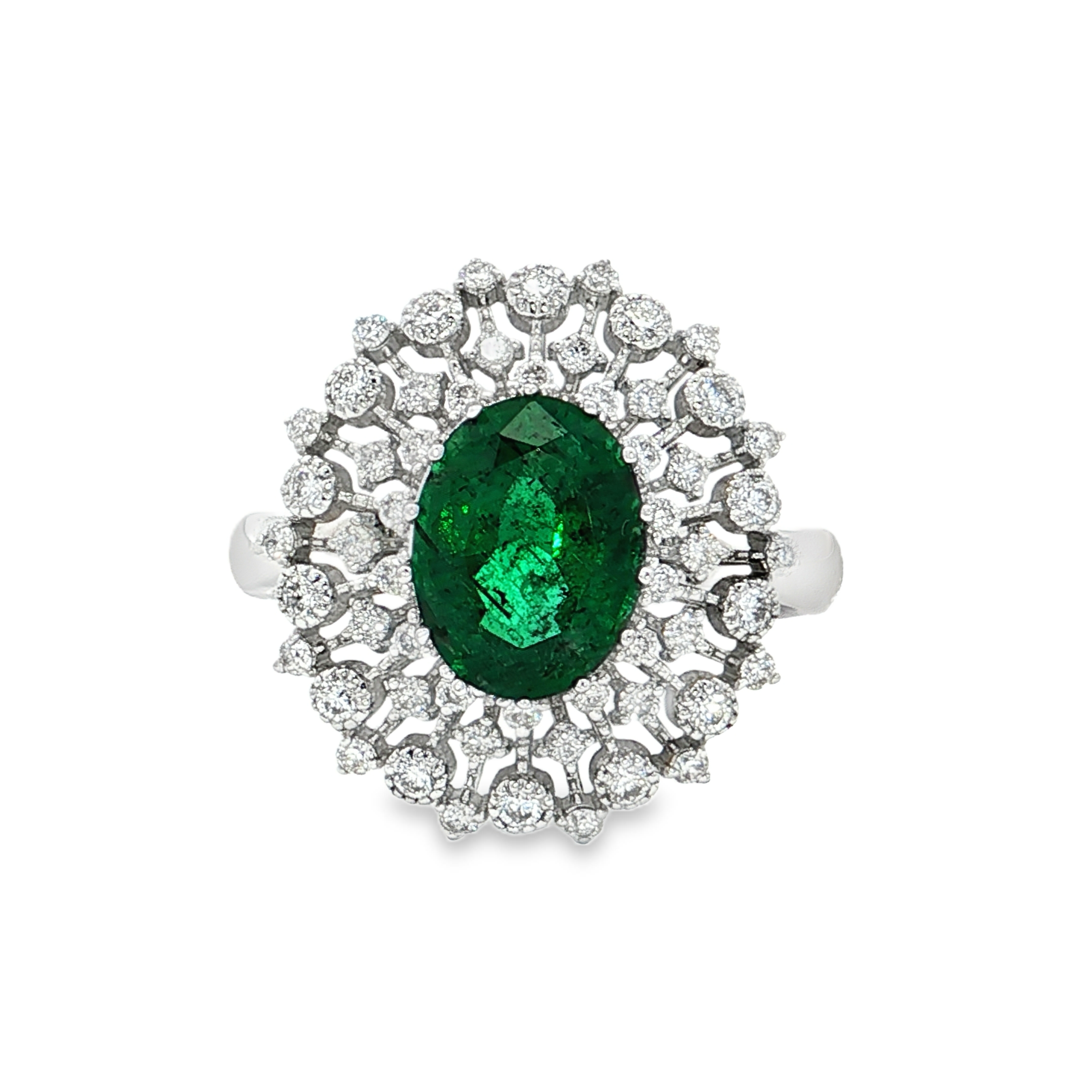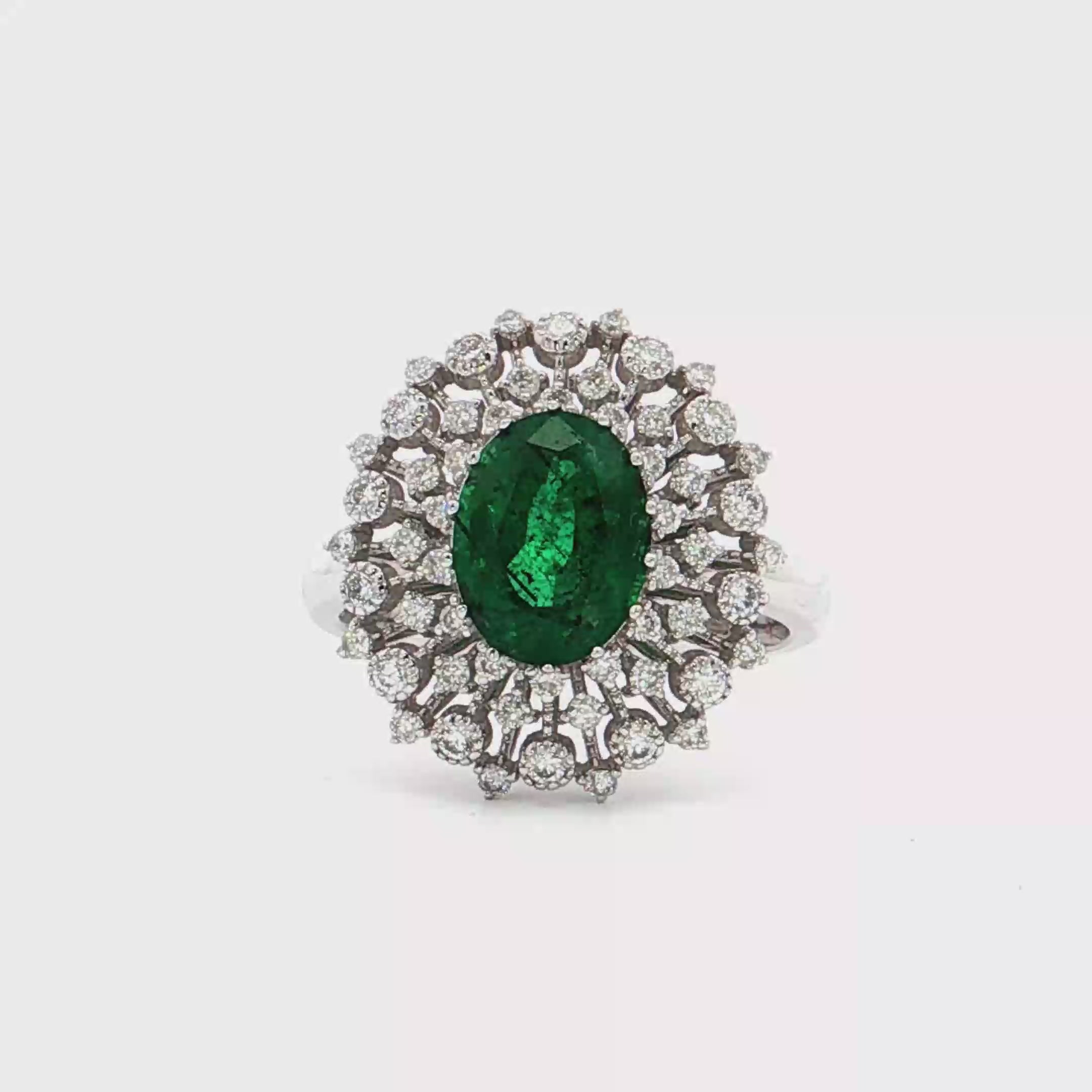 這款雞尾酒戒指以18K金打造,呈現出復古華麗的風格。主石為一顆橢圓形凸圓面切割的祖母綠,其濃郁的綠色調散發出迷人的光彩。戒指的設計精巧,凸顯了祖母綠的獨特魅力,是優雅品味的完美體現。