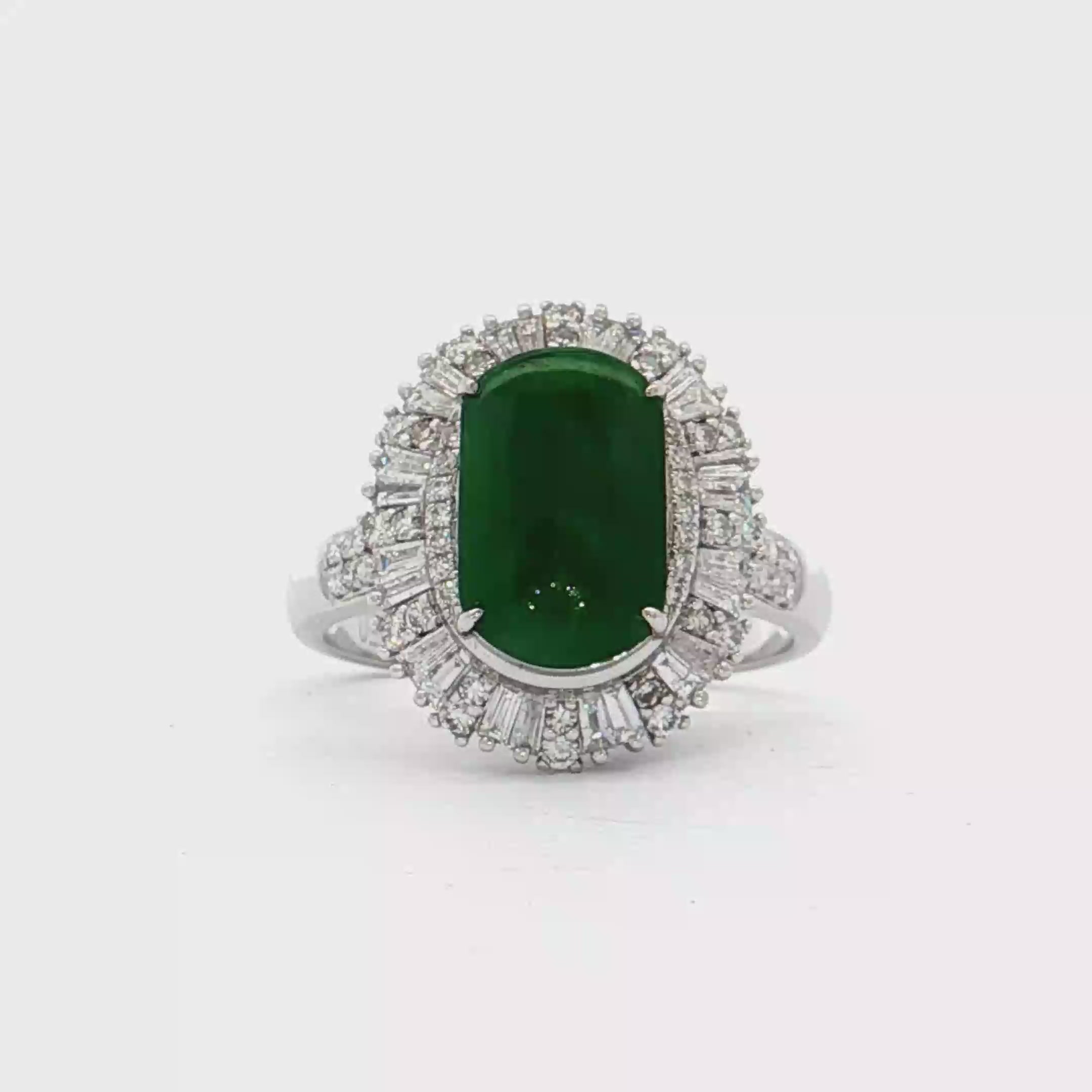 翡翠呈現濃郁的翠綠色,散發著溫潤的光澤。戒指設計經典優雅,適合在各種場合佩戴,為您的造型增添一抹東方韻味。