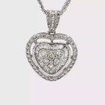 這款精緻的白色黃金心形吊墜項鍊,以18K金為基底,鑲嵌著閃耀的鑽石。心形設計搭配明亮式切割,完美展現了鑽石的光彩和火彩。項鍊整體呈現出優雅和浪漫的氛圍,是表達愛意的理想之選。