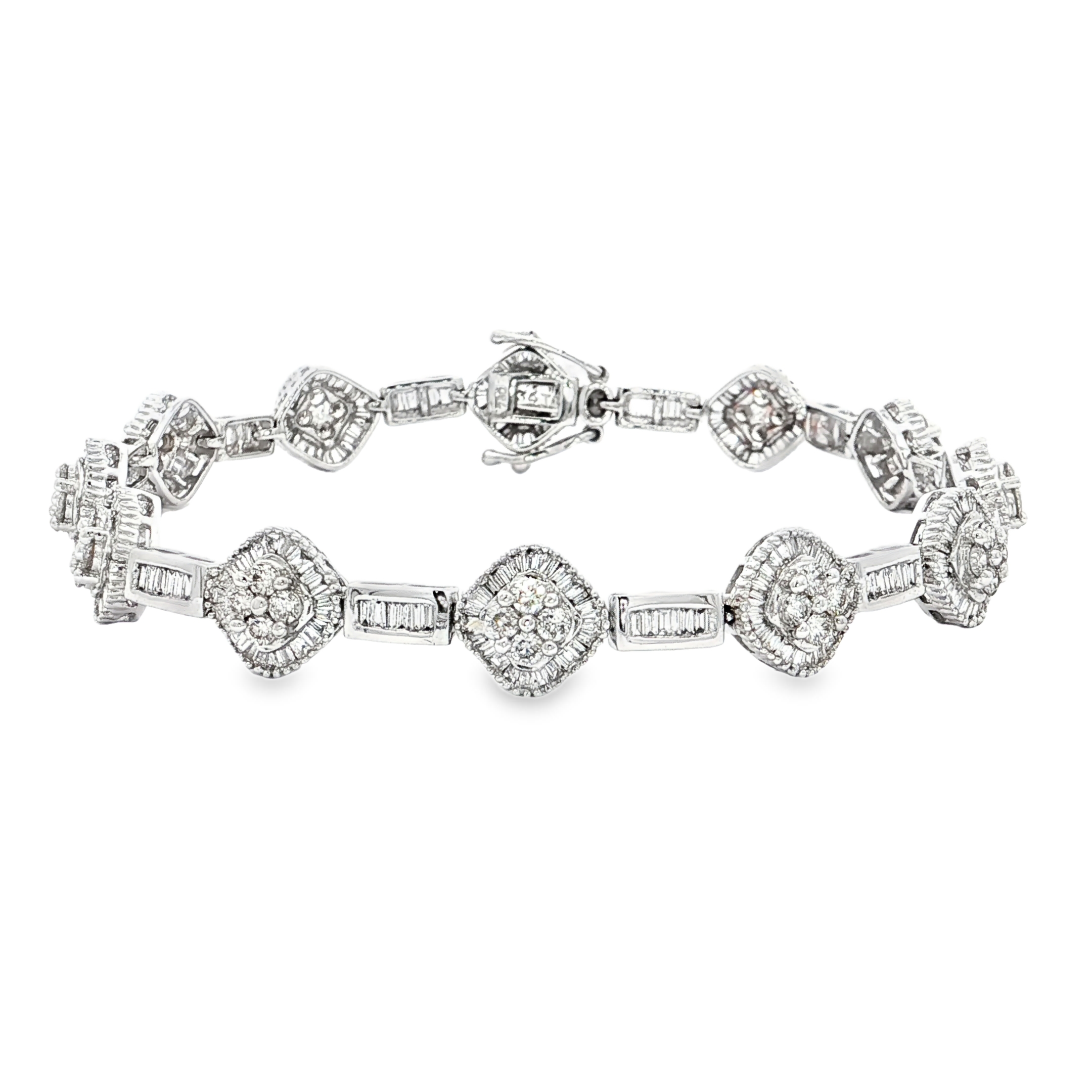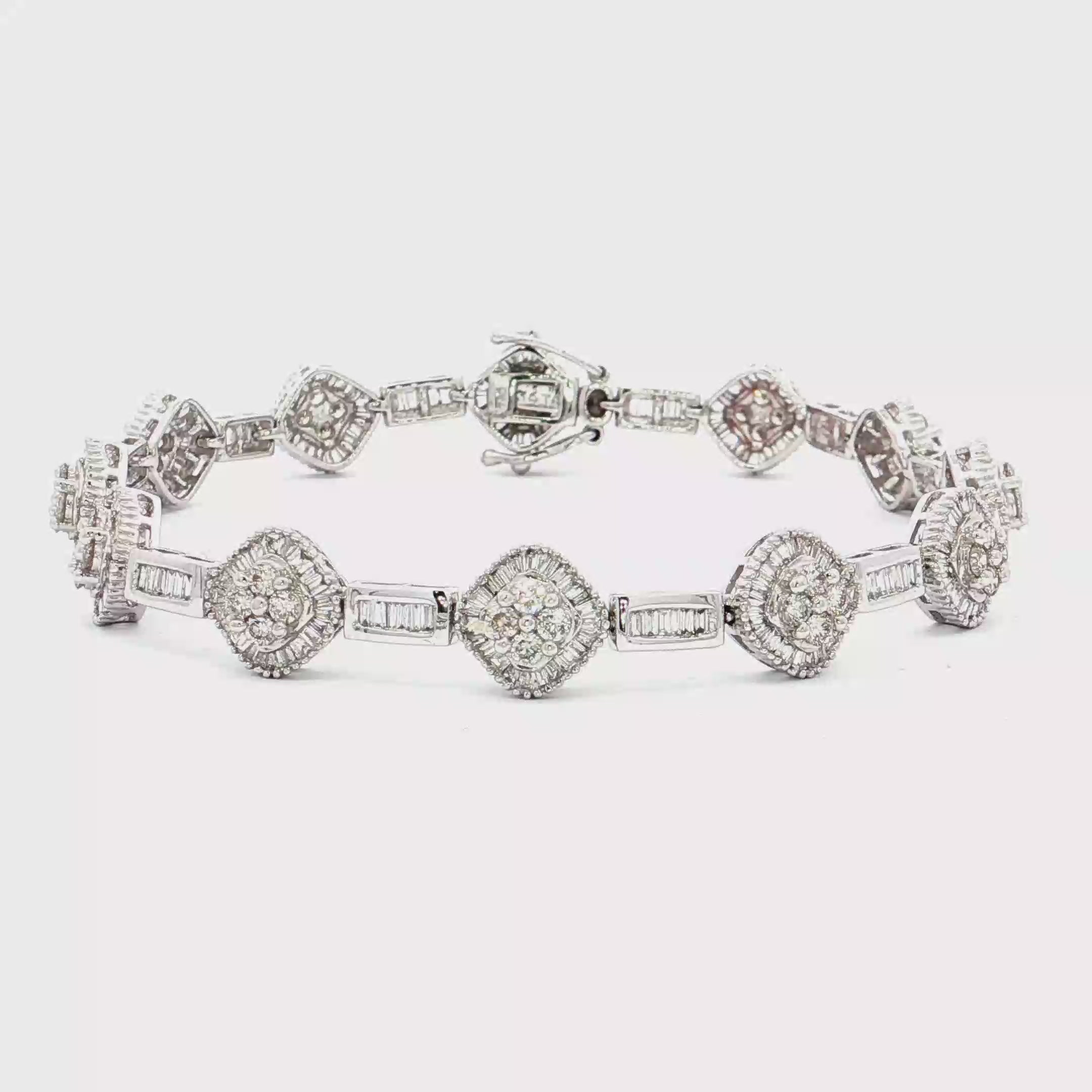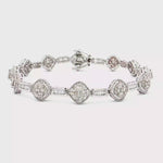 這款精緻的18K白金鑽石手鍊,採用經典的網球鍊設計,每一顆圓形明亮式切割的鑽石都經過精心挑選和鑲嵌,確保其卓越的火彩和光芒。白金的冷豔光澤與鑽石的璀璨相互輝映,展現出高貴典雅的氣質,是適合日常佩戴或特殊場合的完美之選。