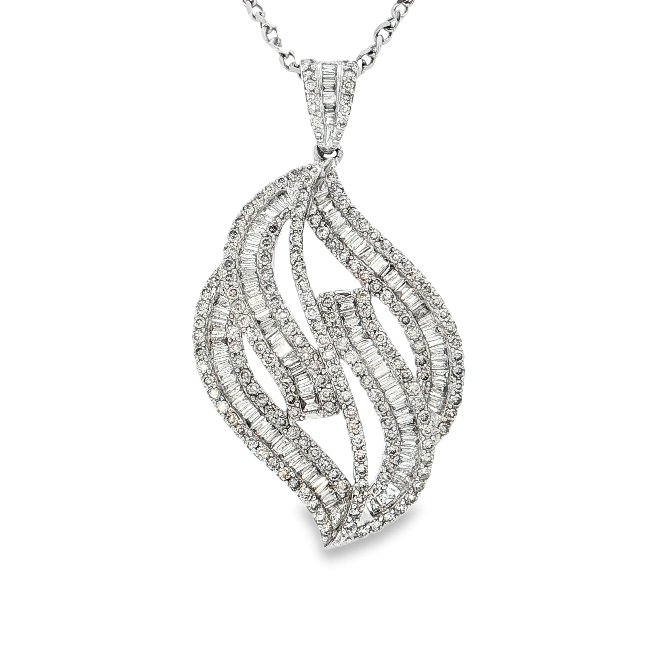 這款精美的鑽石項鍊以優質18K為基底,搭配典雅的白金配色,呈現出高貴的氣質。項鍊主體鑲嵌長棍形切割鑽石,以獨特的階梯式切割工藝,展現鑽石的純淨光芒。整體設計精巧,線條流暢,垂直懸掛時更顯優雅,是您展現個人品味的理想之選。