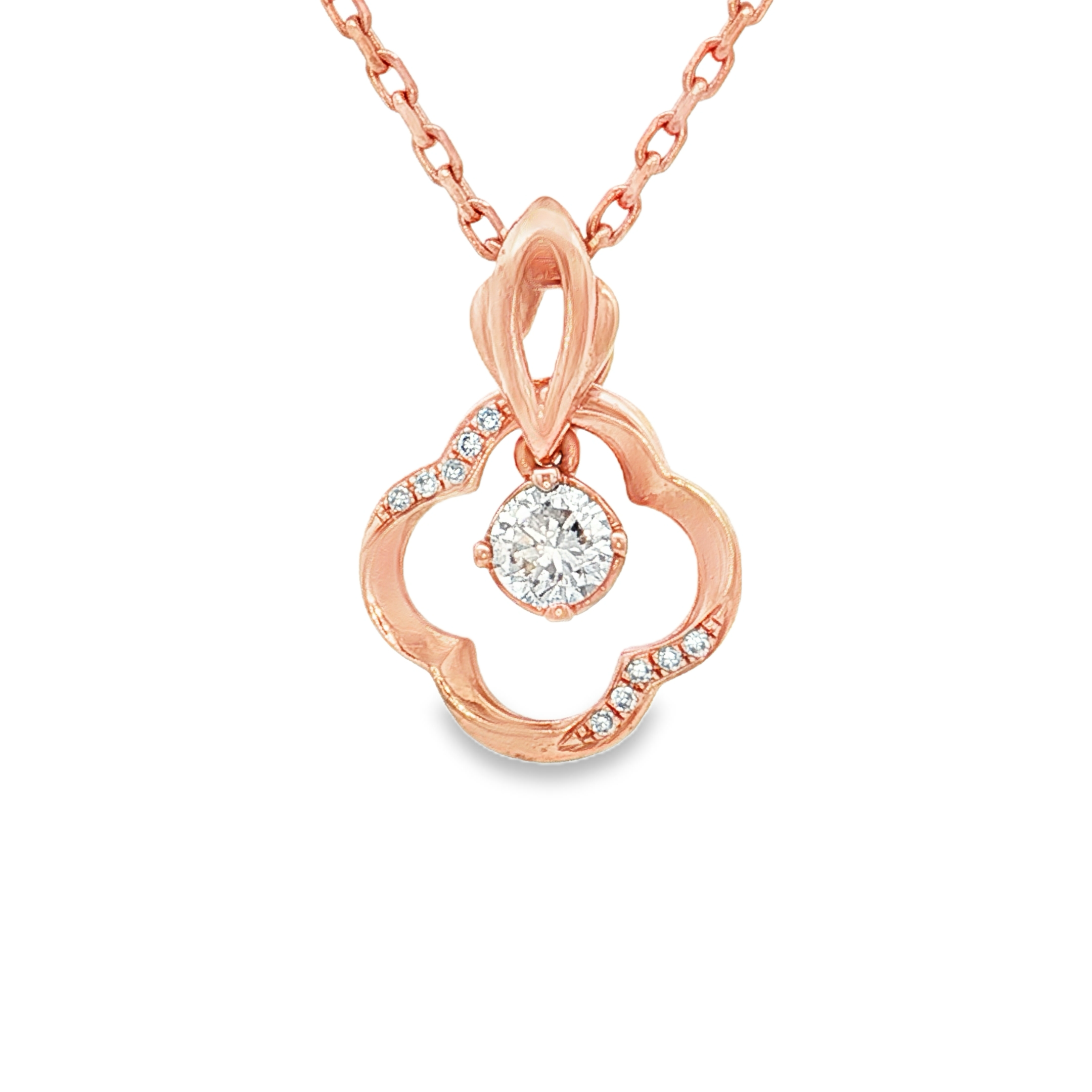 這款迷人的玫瑰金吊墜項鍊,以精緻的四葉草造型設計,鑲嵌明亮式切割的圓形鑽石,璀璨奪目。玫瑰金材質散發溫婉光澤,完美襯托鑽石的耀眼光芒。項鍊設計簡約優雅,適合日常佩戴,為您的造型增添一抹精緻與時尚。