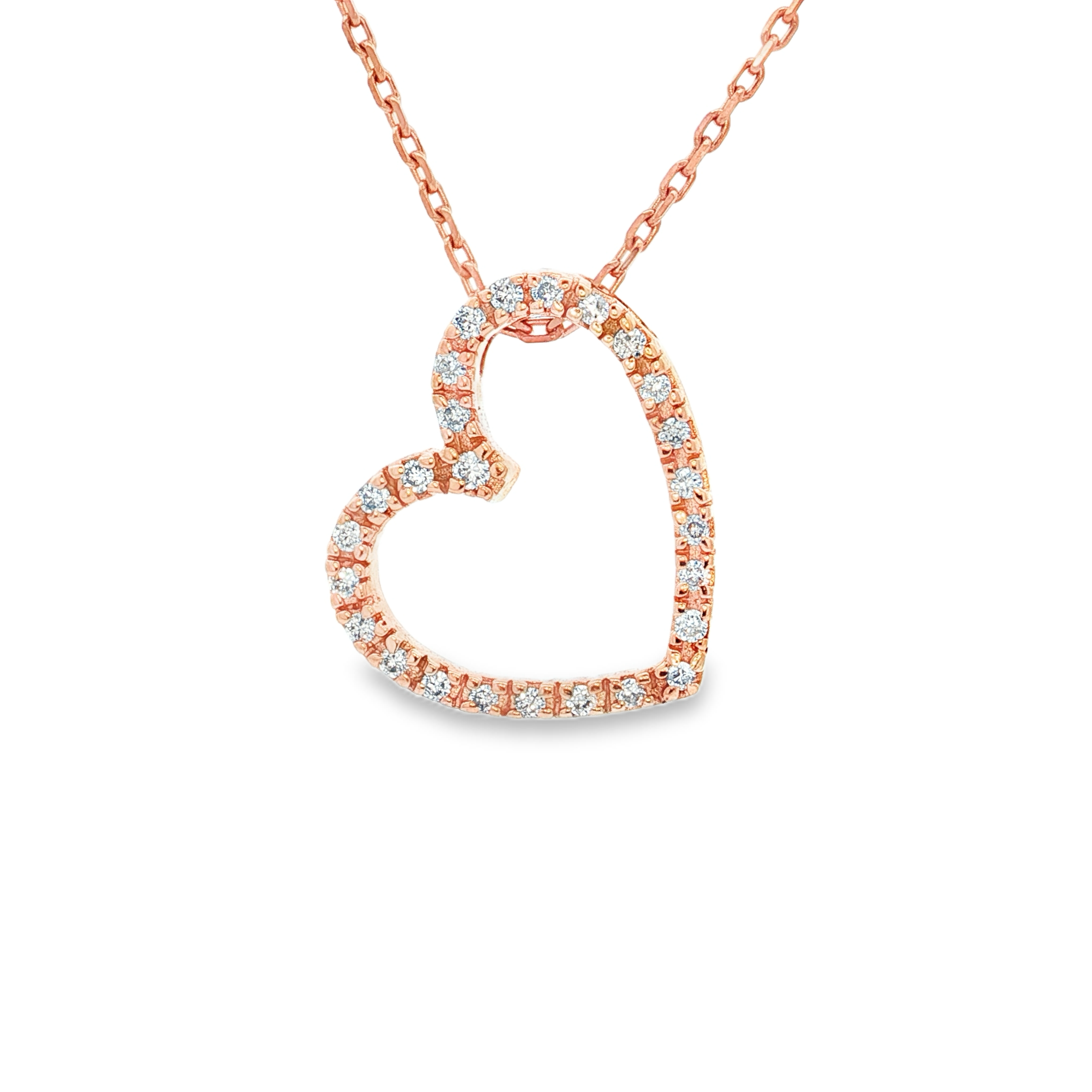 這款精緻的玫瑰金吊墜項鍊,以其簡潔的心形設計,散發著柔美氣息。項鍊主體由閃耀的圓形明亮式切割鑽石鑲嵌而成,璀璨奪目。玫瑰金的溫暖色澤與鑽石的耀眼光芒相得益彰,完美展現出現代女性的優雅品味。