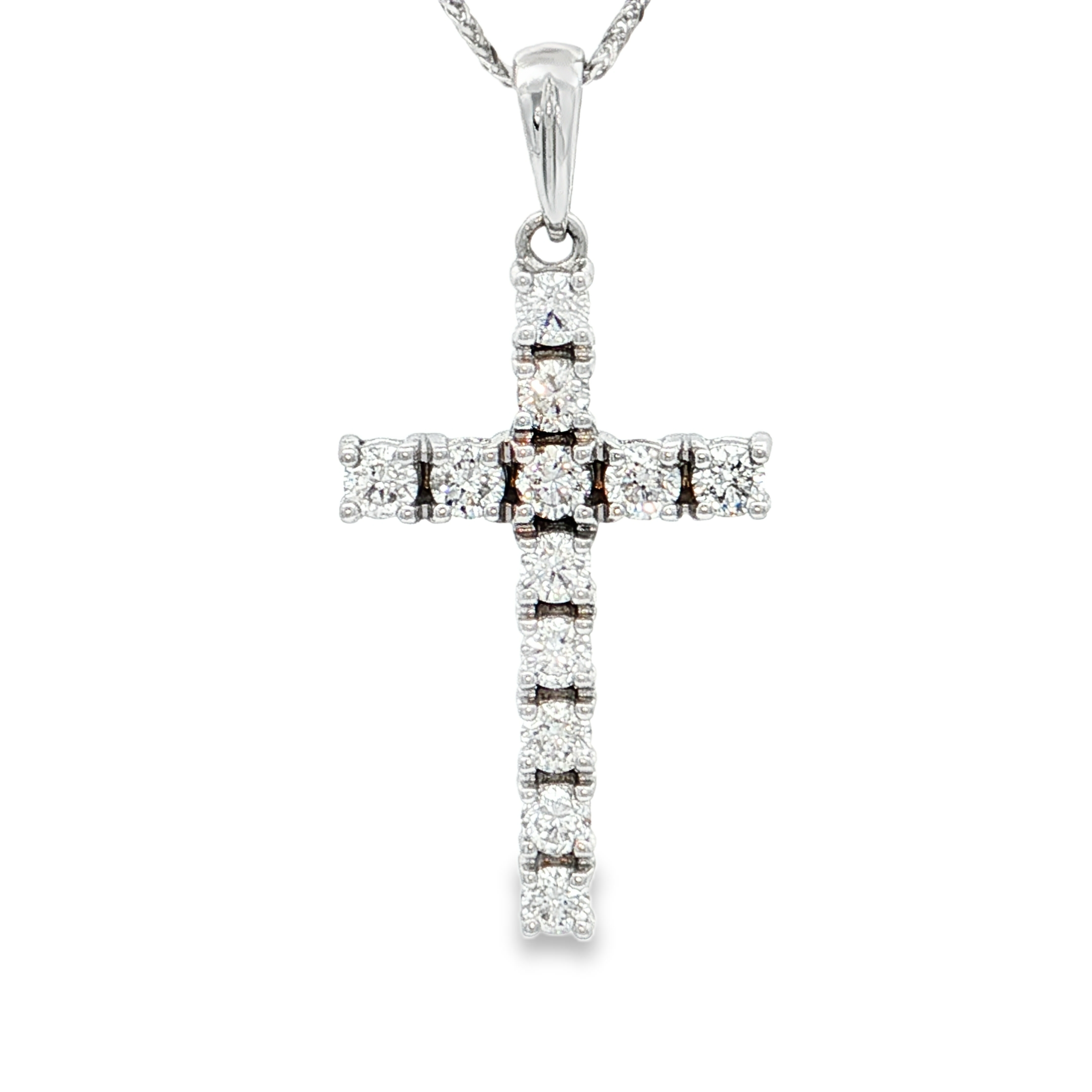 這款精緻的鑽石項鍊,以優雅的十字架造型呈現,採用明亮式切割的圓形鑽石,鑲嵌於光澤的白金銀底座上。設計簡潔而經典,完美地結合了現代感和永恆的優雅,適合日常配戴或特殊場合,散發低調奢華的光芒。
