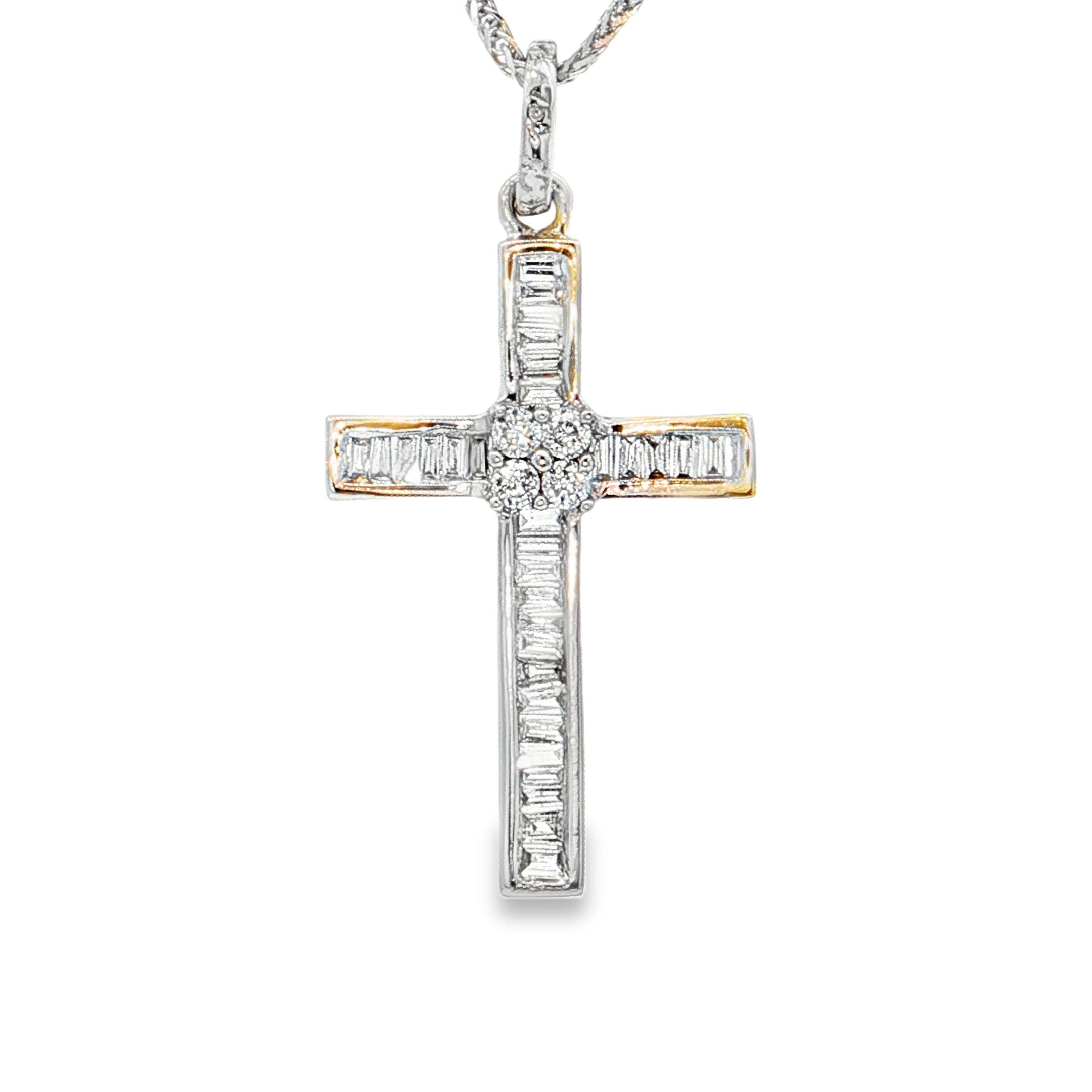 這款精緻的白金吊墜項鍊,以其經典的十字造型,展現永恆的優雅。項鍊鑲嵌著長方形切割的鑽石,以階梯式切割工藝精湛呈現,營造出璀璨奪目的光芒。白金底座更襯托出鑽石的純淨與火彩,無論是日常佩戴或是特殊場合,都能散發出低調奢華的魅力。