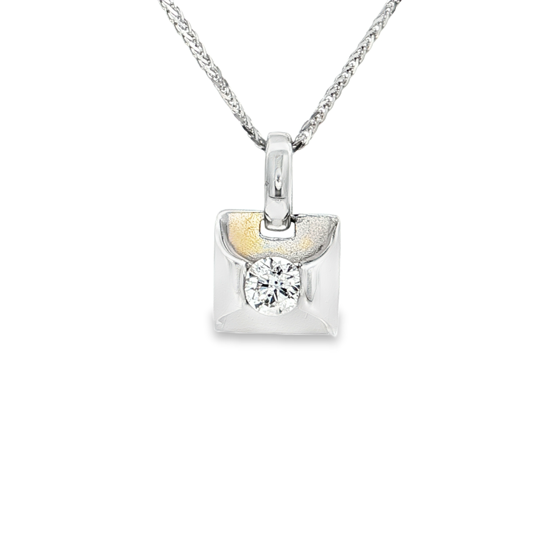 这款精美鑽石項鍊,採用優雅的白18K金鑲嵌,呈現簡約而現代的風格。項鍊中央鑲嵌一顆璀璨的圓形明亮式切割鑽石,散發迷人光芒。此鑽石項鍊設計精巧,適合日常佩戴,為您的造型增添一抹精緻的亮點。