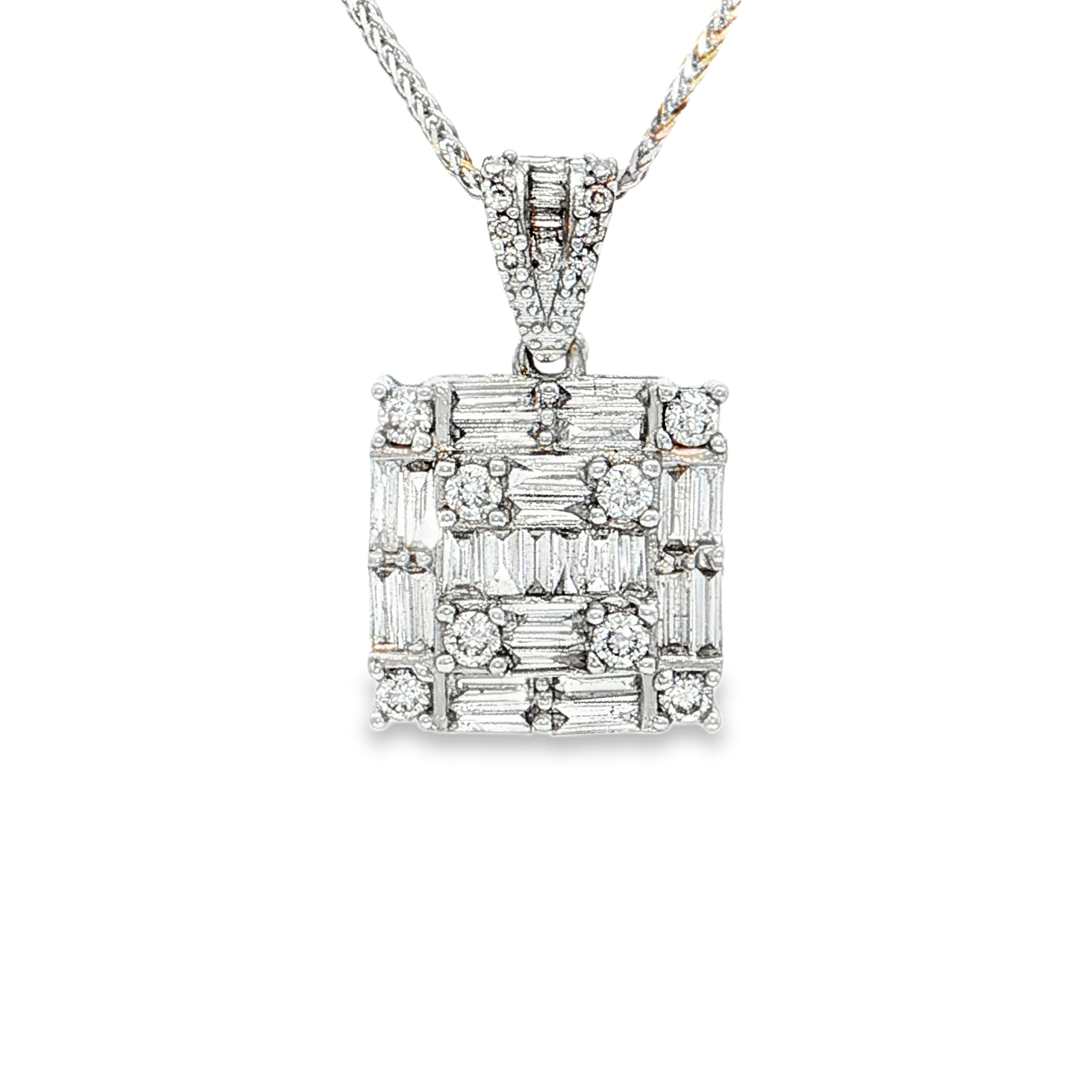 這款精美的鑽石項鍊採用純18K白金呈現出優雅的方形幾何設計。項鍊主體鑲嵌多顆明亮式切割鑽石,以混合切割工藝呈現出璀璨的光芒。鑽石以其卓越的火彩和精湛的工藝,彰顯佩戴者的高貴品味和獨特魅力。適合在各種重要場合佩戴,是您展現個人風格的完美之選。