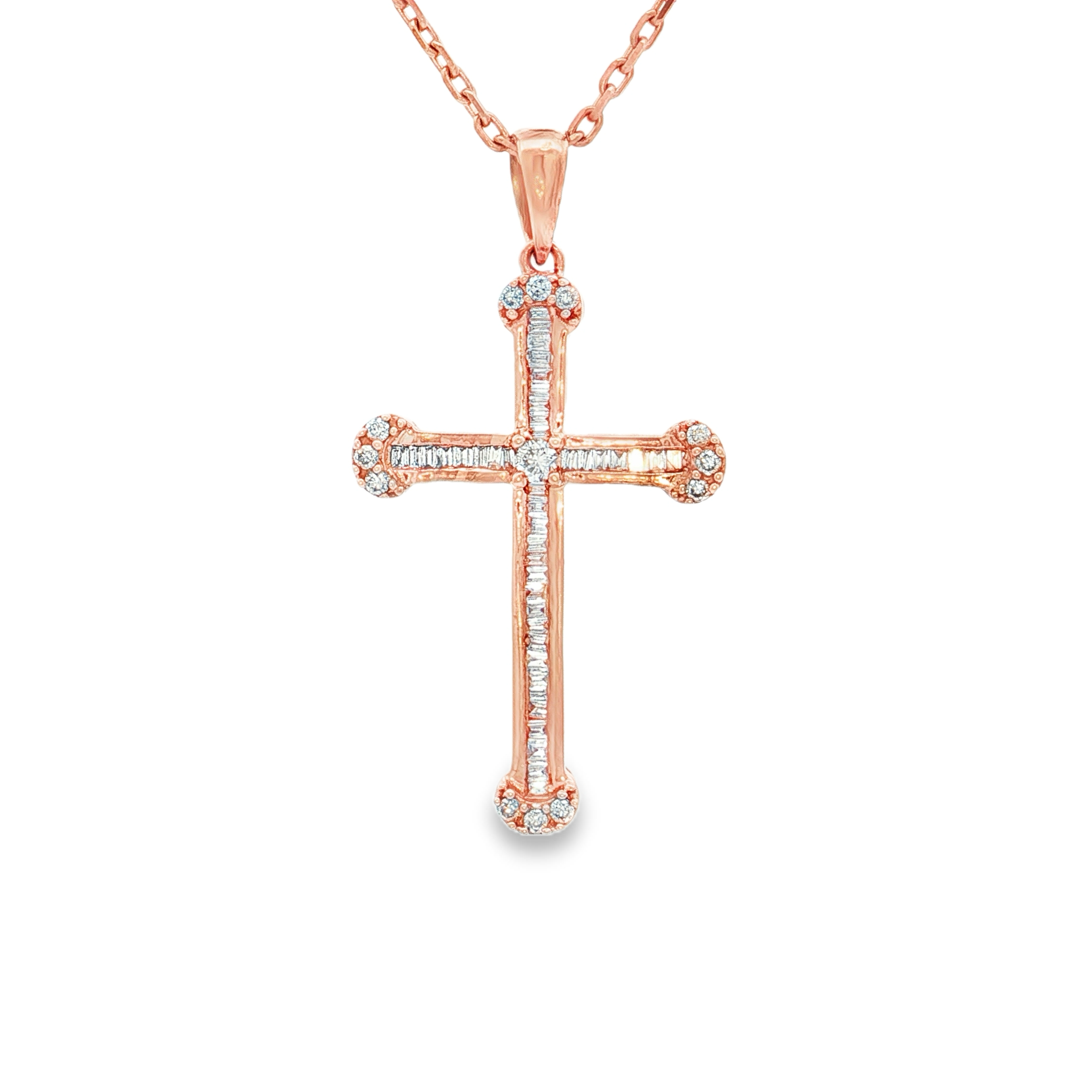 這款迷人的玫瑰金吊墜項鍊,以精湛工藝打造,呈現精美的十字架造型。項鍊採用高品質玫瑰金,散發溫暖而優雅的光澤。十字架上鑲嵌著璀璨的圓形明亮式切割鑽石,在光線下閃耀奪目,增添奢華氣息。設計簡約而不失精緻,適合日常佩戴,彰顯個人品味。