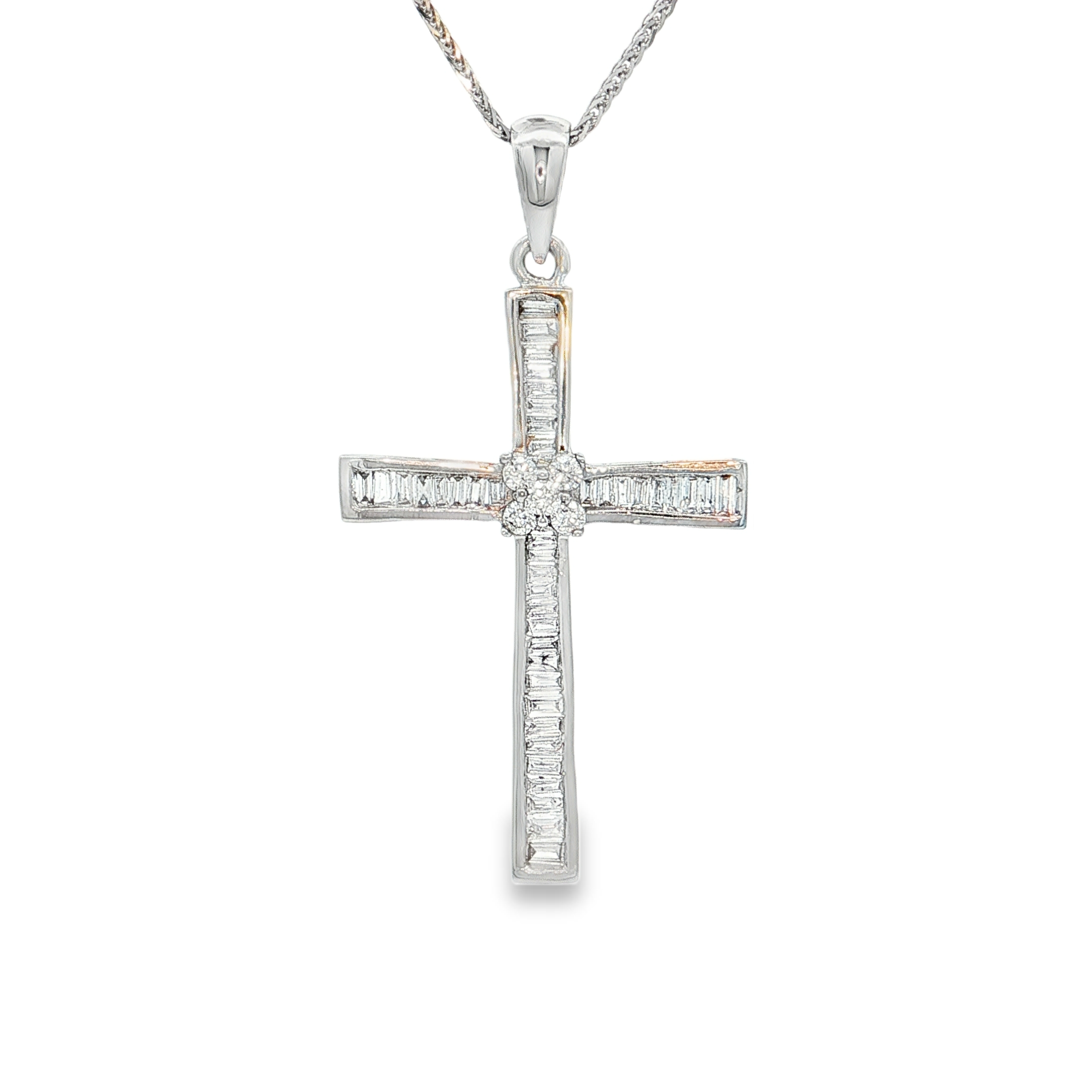 這款精緻的吊墜項鍊以18K金基底,飾有閃耀的長棍形切割鑽石,呈現出經典的十字架造型。白金的色澤增添了高貴感,階梯式切割賦予鑽石獨特的光芒,完美展現佩戴者的優雅品味。適合日常穿搭,也為特殊場合增添亮點。