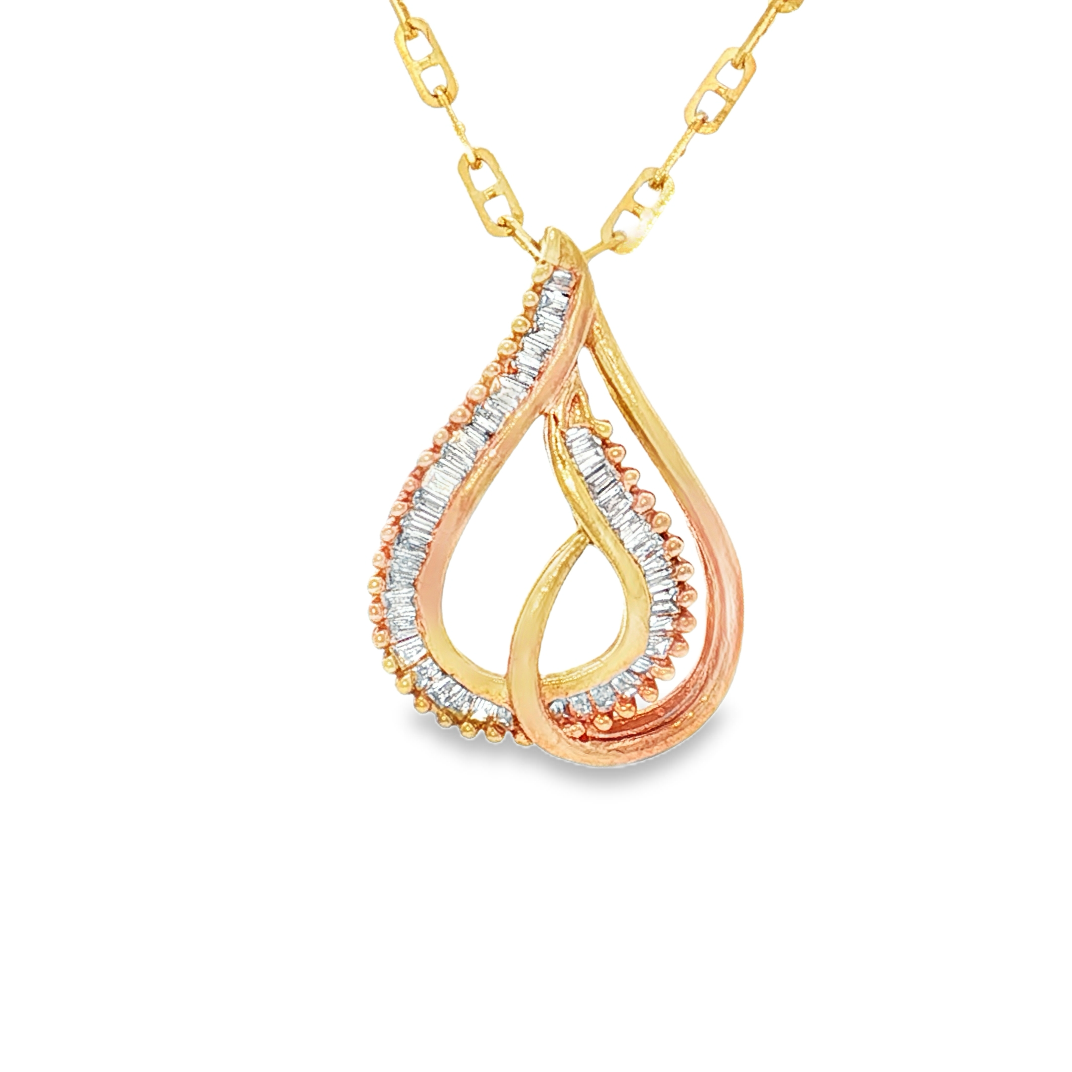這款精緻的吊墜項鍊採用經典的淚滴造型,以溫潤的黃金為基底,打造出流暢而優雅的線條。項鍊主體鑲嵌著長棍形切割的鑽石,鑽石以精湛的工藝排列,散發出璀璨的光芒,為整體設計增添了奢華感。此項鍊不僅是時尚配飾,更是展現個人品味與氣質的完美之選。