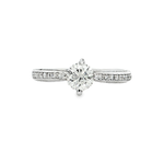 這款精緻的訂婚戒指以鉑金打造,散發著低調奢華的光芒。主鑽採用明亮式切割的圓形鑽石,璀璨奪目,完美展現其卓越的火彩與光芒。簡約的設計更突顯了鑽石的純淨與優雅,是永恆愛情的完美象徵。