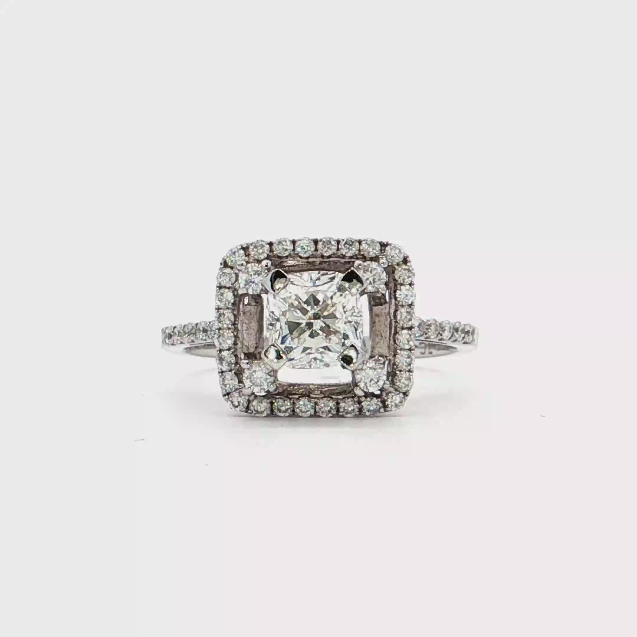 這款多石戒指採用18K金打造,呈現出經典的白色黃金光澤。主鑽為墊形切割,以其卓越的明亮式切割風格而著稱,散發出璀璨的光芒。戒指設計精緻,適合各種場合佩戴,是您珠寶收藏中不可或缺的珍品。
