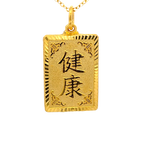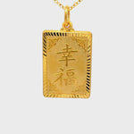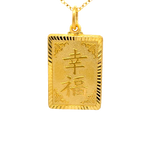 這款吊墜以精緻的黃金打造,呈現矩形設計,表面刻有充滿祝福寓意的漢字「幸福」。吊墜的邊緣裝飾有精細的幾何圖案,增添了視覺層次感和獨特性。簡約而富有文化氣息,適合日常佩戴,寓意美好。