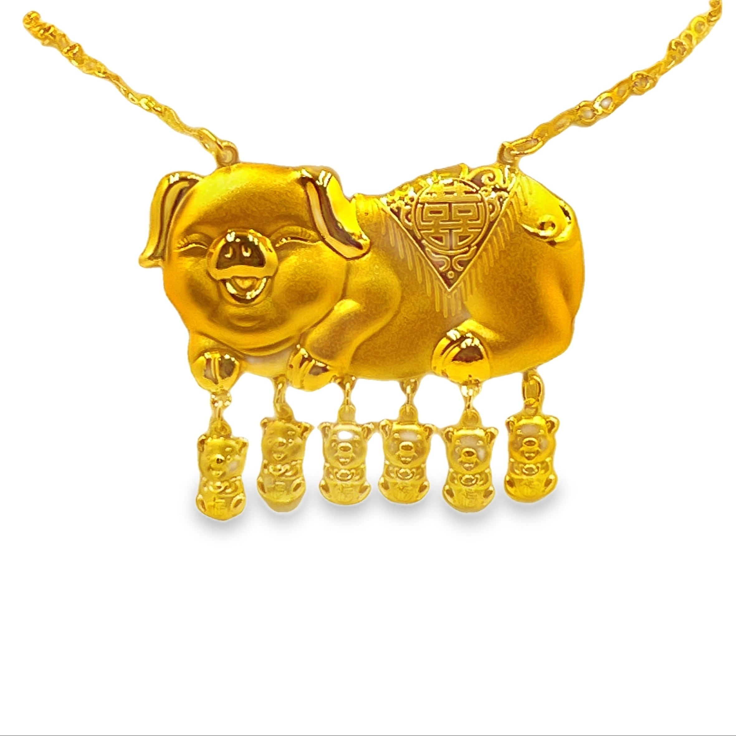 這款精緻的黃金吊墜,以可愛的豬造型呈現,寓意吉祥如意,財源廣進。吊墜設計獨特,下方懸掛著一排小熊,增添了趣味和童真。黃金材質的光澤與精細的工藝相結合,無論是日常佩戴還是特殊場合,都能展現您的獨特品味和美好祝願。