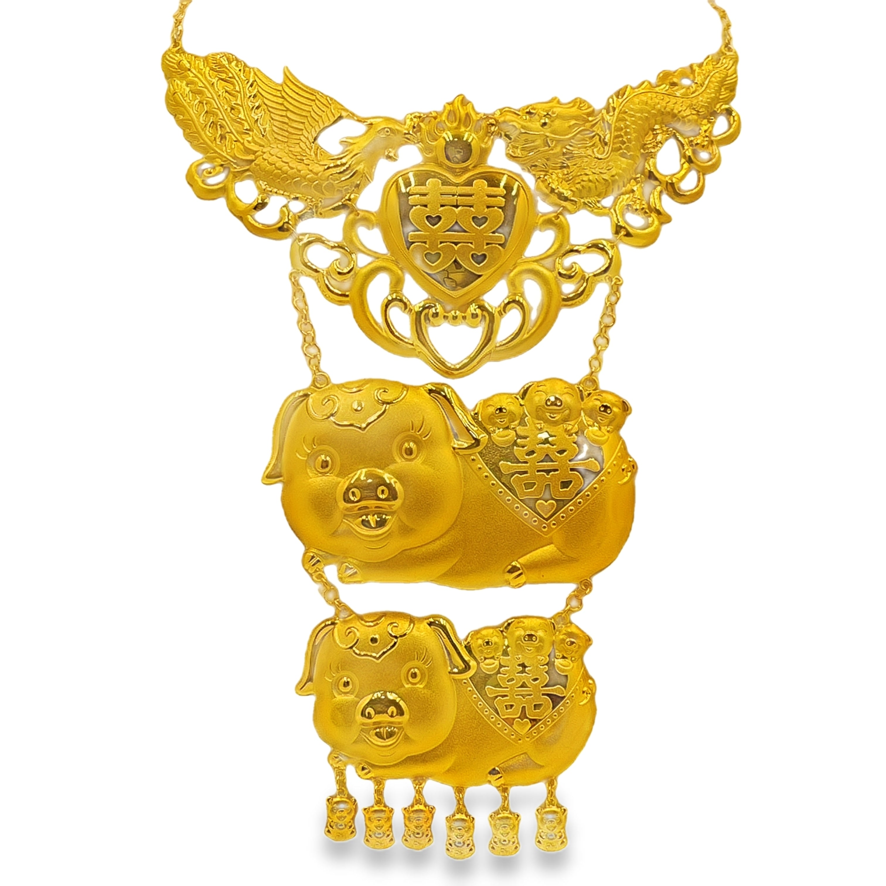 這款精緻的黃金吊墜,以傳統的龍鳳圖案和可愛的小豬造型為主,寓意吉祥如意、多子多福。整體設計富麗堂皇,細節精雕細琢,是送禮或自戴的絕佳選擇,為您的造型增添一份傳統韻味。