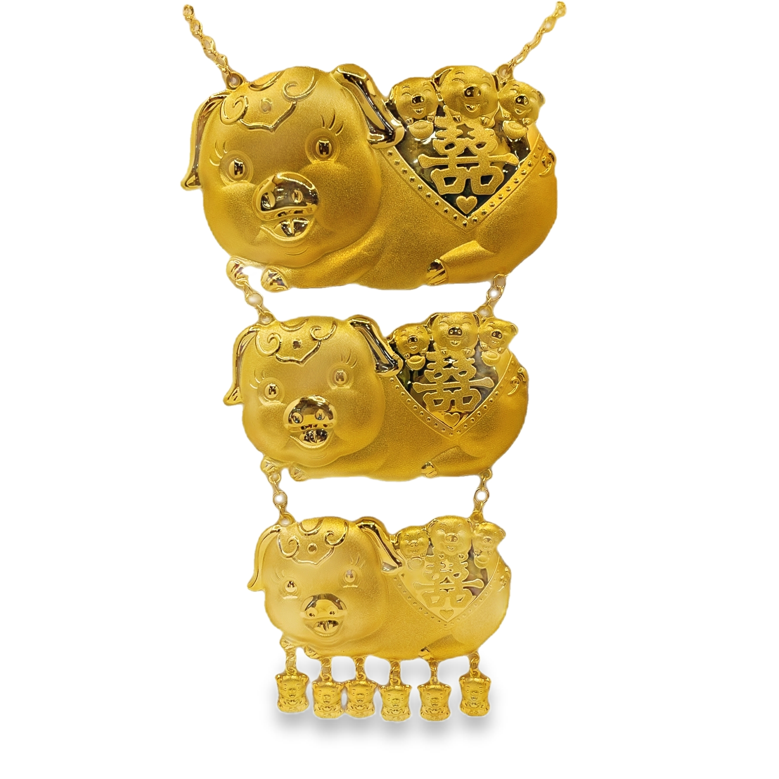 這款精緻的黃金鏈墜,以可愛的豬造型設計,寓意吉祥如意、財源廣進。三個金豬吊墜相連,更顯份量與獨特。適合日常佩戴,為您的造型增添一份趣味與祝福。