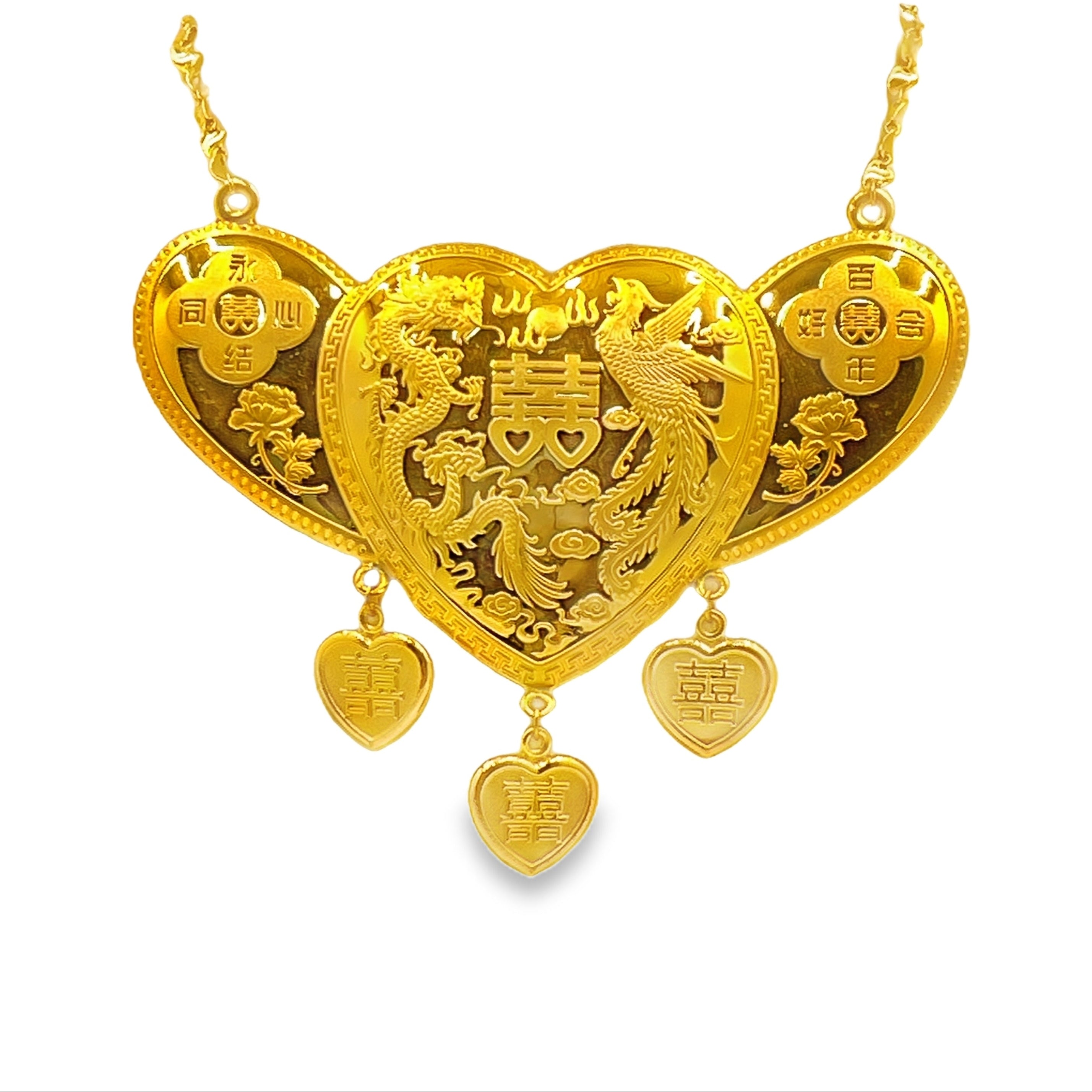 此款黃金吊墜以精湛工藝雕琢而成,主體為心形設計,寓意著永恆的愛戀。吊墜上精細地刻畫著龍鳳呈祥的圖案,象徵著吉祥如意、夫妻和睦。兩側搭配帶有傳統吉祥圖案的圓形吊墜,更添東方韻味。整體設計典雅大方,是婚慶或重要場合的理想配飾。
