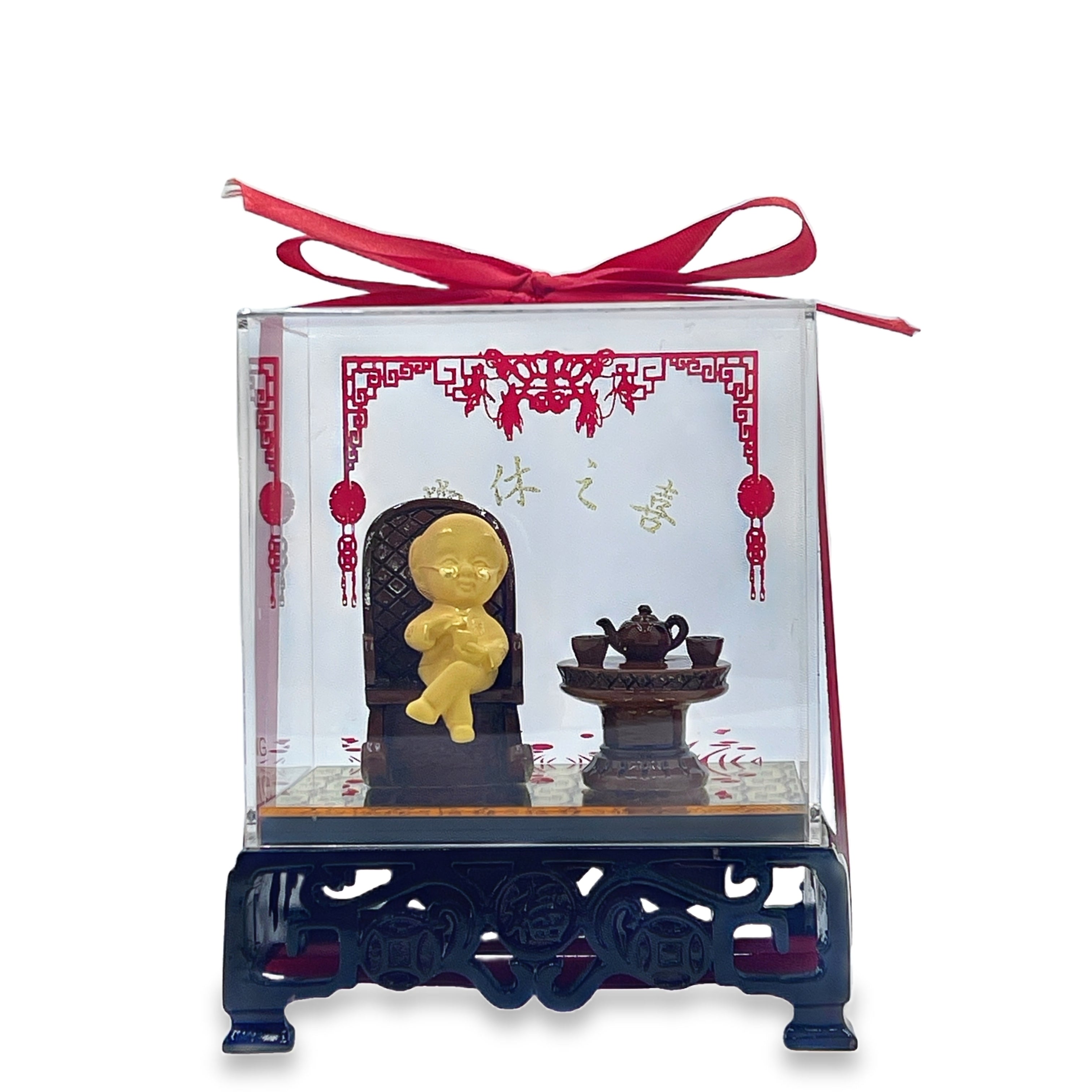 此精美擺件呈現了一位老者安坐於椅上的悠閒場景,搭配精緻茶具,營造出寧靜祥和的氛圍。透明外盒繫有紅色絲帶,更添一份喜慶與祝福,適合擺放於家中或辦公室,增添文化氣息