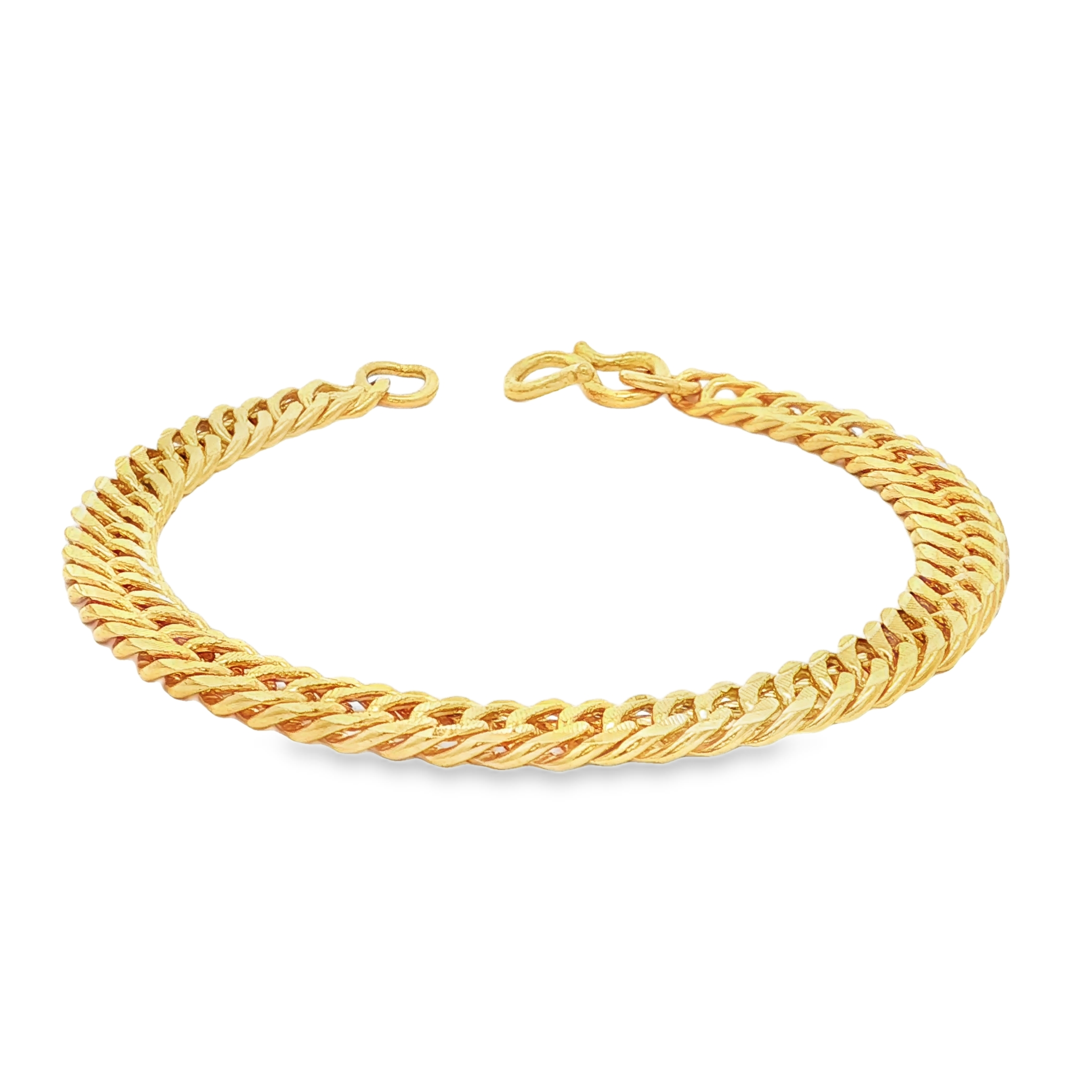 這款精緻的黃金手鍊,以其獨特的鏈條設計展現出經典與現代的完美結合。每一節鏈條都經過精心打造,呈現出流暢而堅固的質感。黃金的光澤為手腕增添一抹奢華的色彩,無論是日常佩戴還是特殊場合,都能展現佩戴者的優雅品味和獨特風格。此手鍊不僅是一件精美的飾品,更是一份值得珍藏的藝術品。