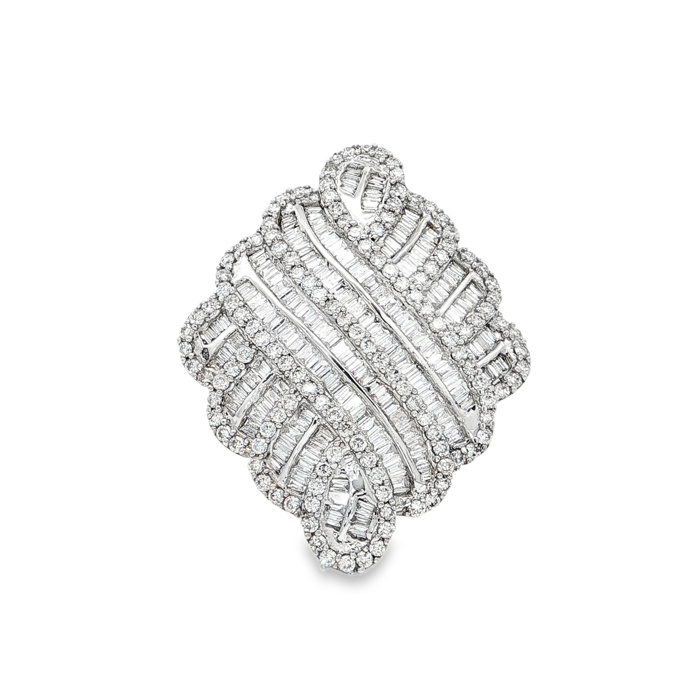 這款雞尾酒戒指採用精緻的白金打造,呈現出華麗的幾何美感。戒指上鑲嵌著長方形切割的鑽石,以階梯式切割工藝呈現,閃耀奪目光芒。鑽石的排列和設計突顯了戒指的獨特風格,適合在各種重要場合佩戴,展現佩戴者的高雅品味和時尚觸覺。