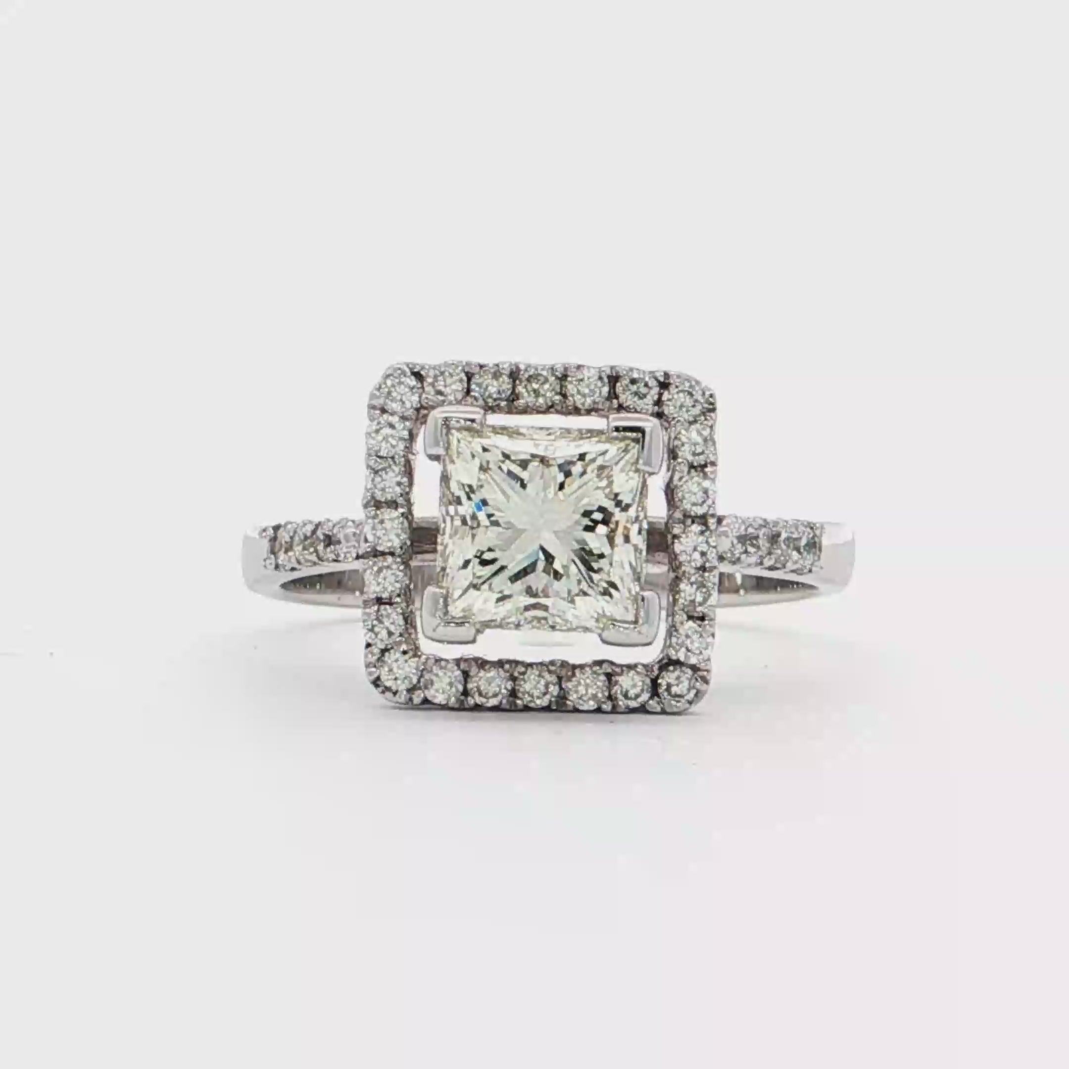 這款精美的戒指採用白金製成,設計獨特的多石款式,主石為一顆公主方形切割的鑽石,以其明亮式切割展現耀眼光芒。戒指整體設計簡約現代,適合日常佩戴,展現佩戴者的高雅品味。