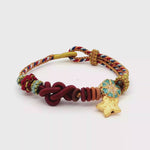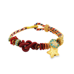 這款獨特的手鍊採用精湛的編織工藝,結合了多種色彩的繩線,展現出濃厚的民族風情。手鍊上點綴著一顆圓形凸面切割的藍綠色綠松石,其獨特的紋理和色彩為整體設計增添了一抹自然氣息。吊飾的星形設計,更顯時尚與個性