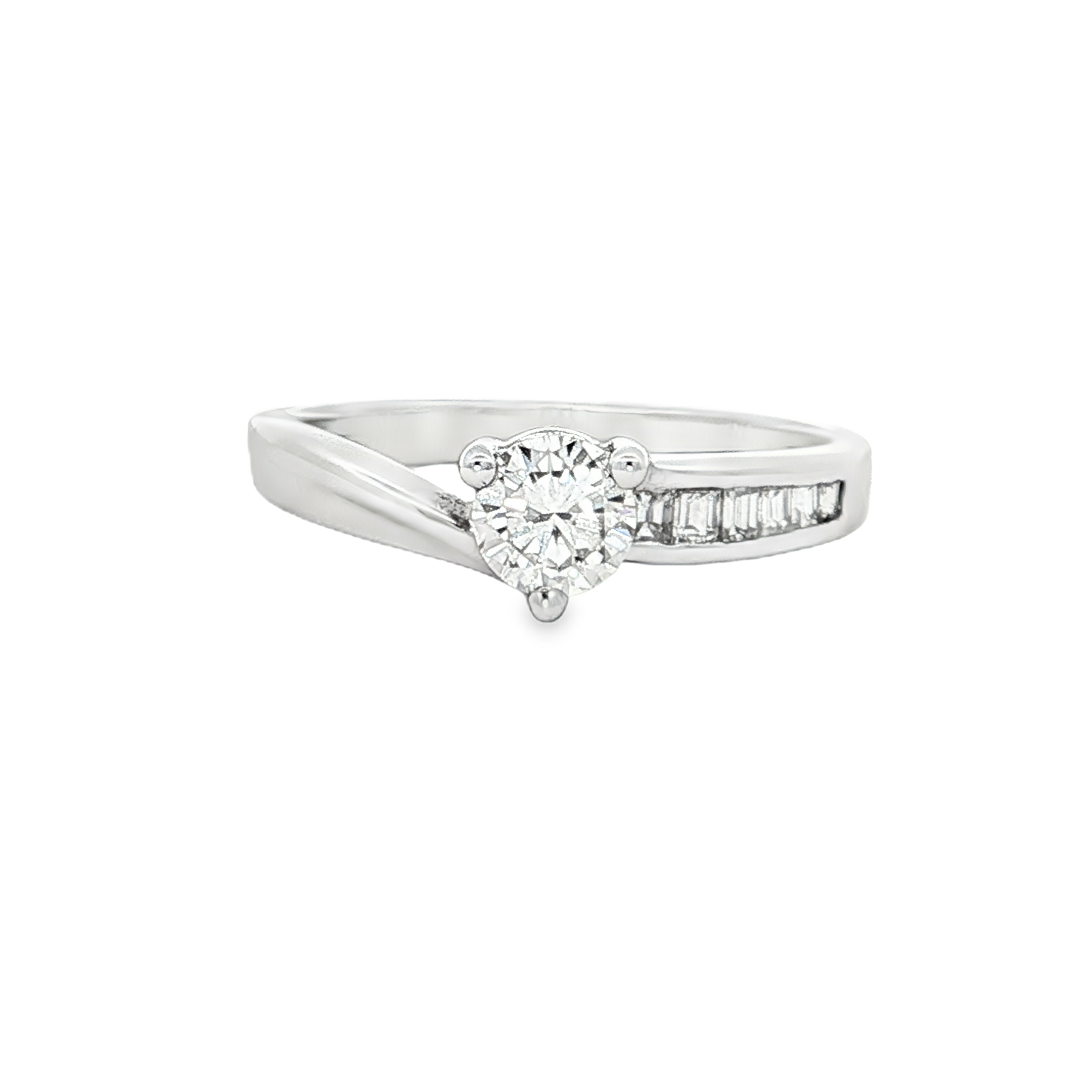 這款精美的多石戒指採用18K金打造,呈現出優雅的白色金光澤。戒指正面朝上,完美展示其精湛工藝。主鑽為圓形明亮式切割,散發璀璨光芒。整體設計簡潔大方,適合日常佩戴,盡顯高貴品味。