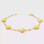 這款精緻的黃金手鍊,以可愛的心形設計為主,散發著溫暖的光澤。每個心形都經過精細的雕琢,呈現出獨特的紋理和立體感。手鍊的鏈條設計簡約而優雅,完美襯托出心形吊墜的精美。無論是日常佩戴還是特殊場合,都能為您的造型增添一份甜美與精緻。