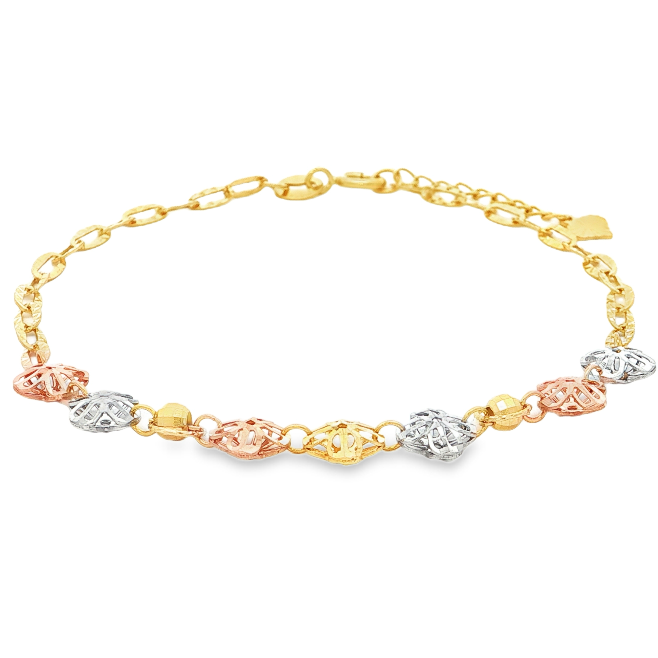 這款精緻的18k黃金手鍊,以其獨特的鏈條設計和三色金球裝飾脫穎而出。每個金球都經過精細的鏤空處理,呈現出精巧的花紋,為整體增添了幾分優雅氣息。適合日常佩戴,展現低調奢華的品味。