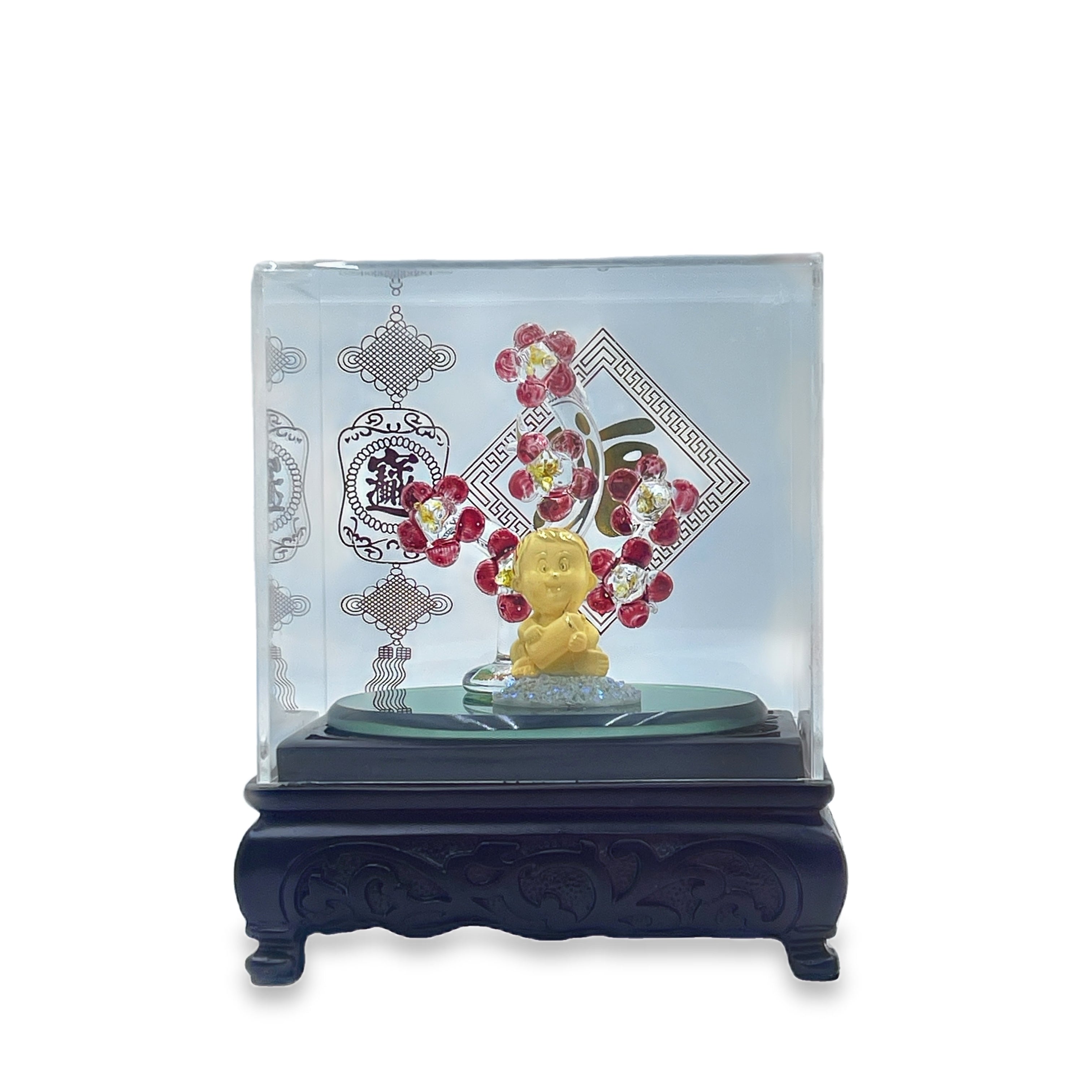 精緻的金色童子擺件,置於透明展示盒內,底座為雕花黑木,增添古典氣息。盒內飾有紅色花朵,寓意吉祥如意,為居家或辦公室帶來美好祝願。