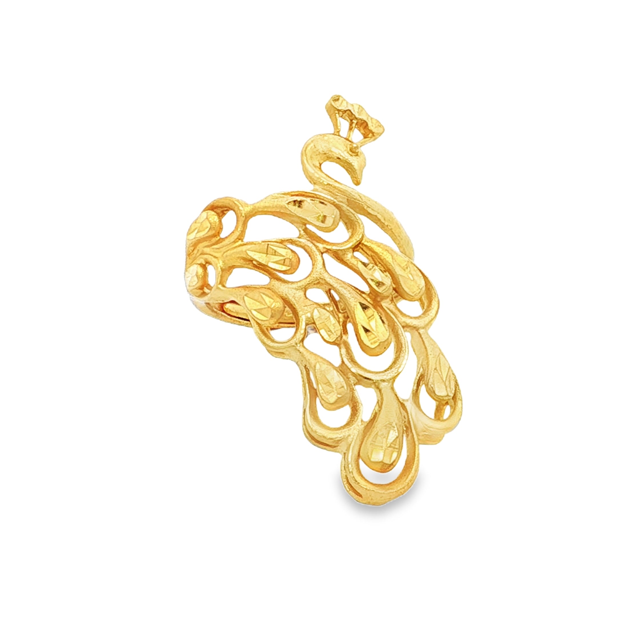 這款精緻的雞尾酒戒指以其獨特的孔雀造型脫穎而出,戒身採用亮麗的黃金打造,設計充滿藝術感。