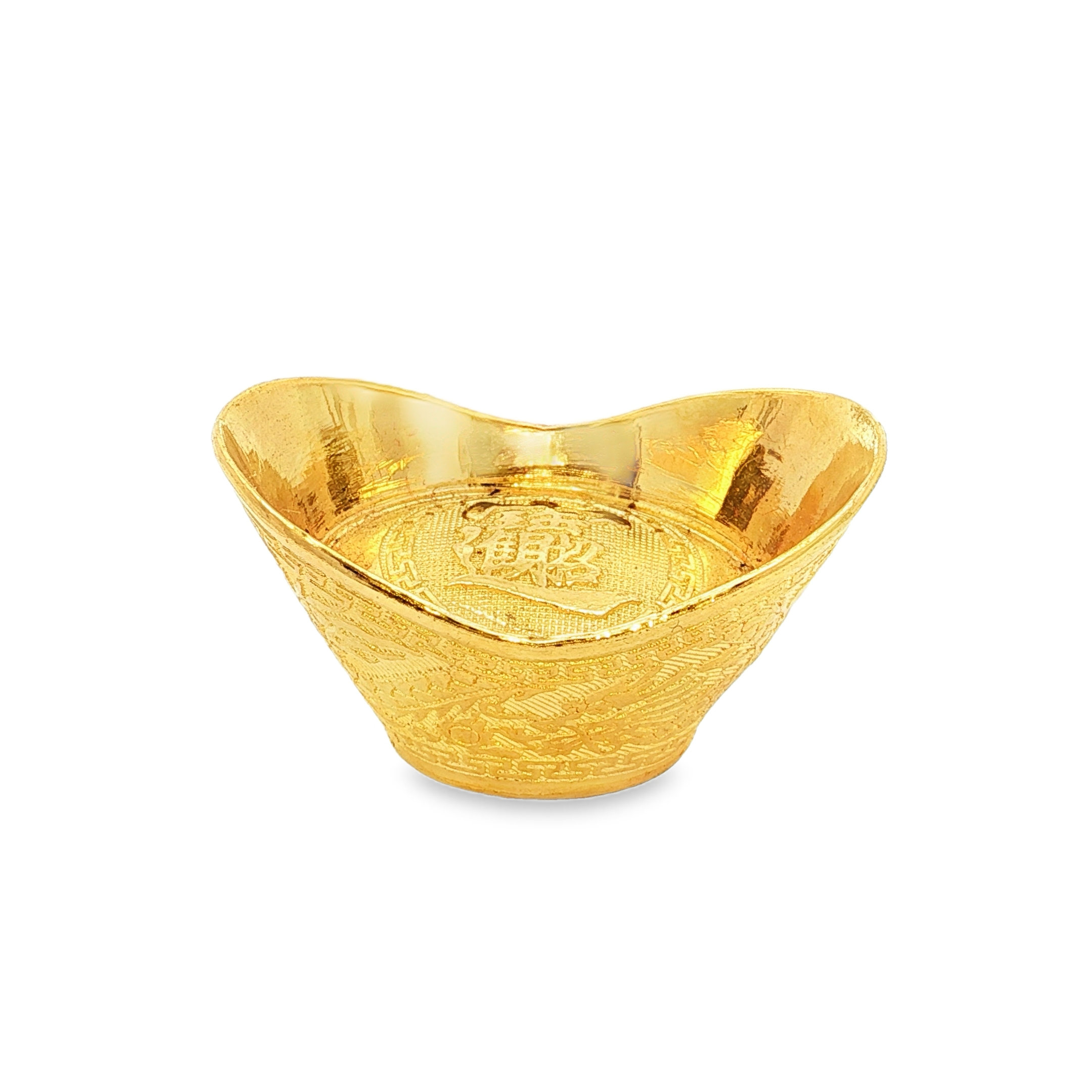 精雕細琢的金元寶,寓意財源廣進、富貴吉祥。金光閃耀,造型飽滿,是饋贈親友、收藏投資的理想之選。精美的紋飾更添一份古韻與文化內涵,為您的生活增添一份尊貴與品味。