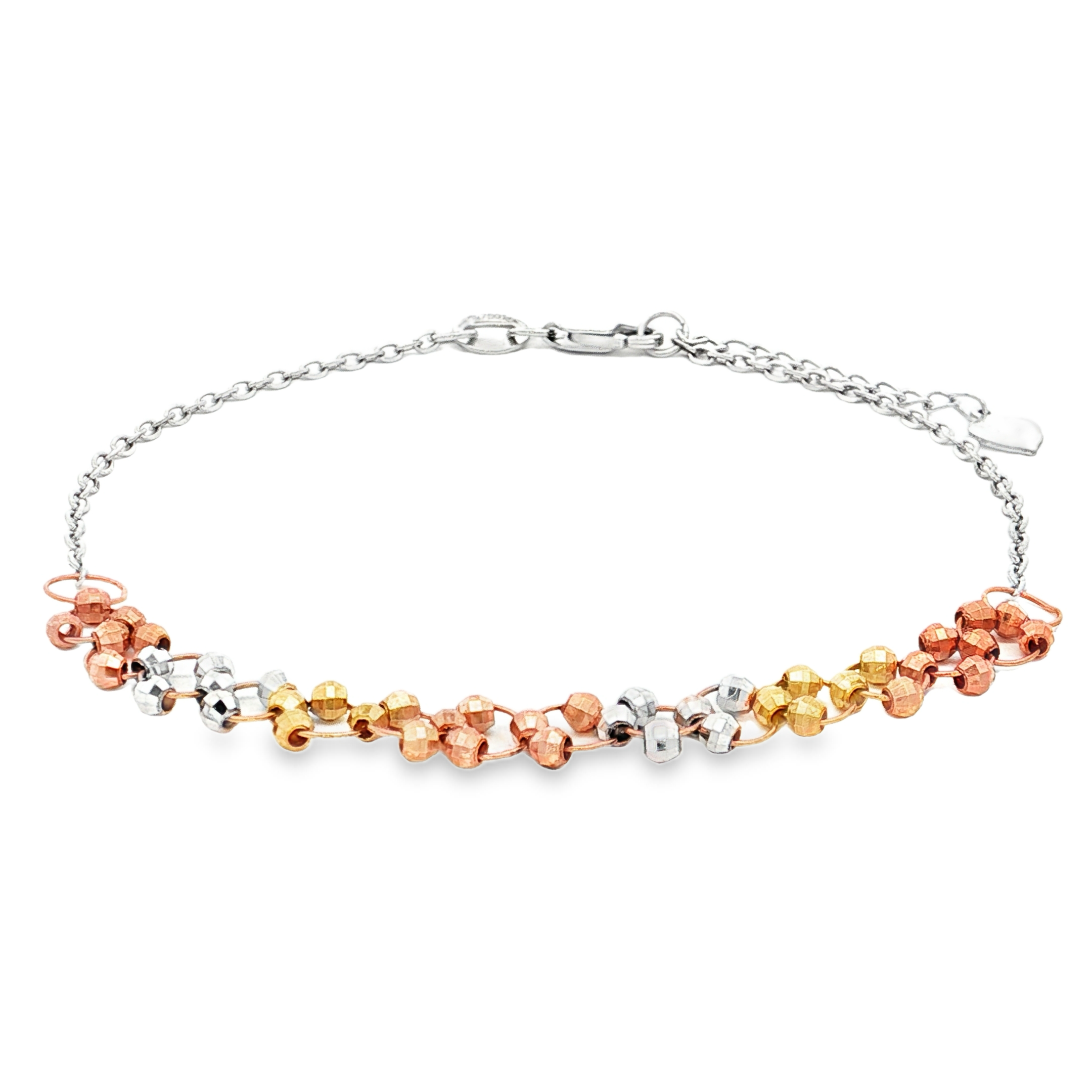 這款精緻的18K黃金手鍊,以其簡約的鏈條設計和多色的珠子裝飾而著稱。不同材質的珠子巧妙地排列,為手腕增添一抹現代感和時尚氣息。適合日常佩戴,也適合搭配各種服裝,展現個人風格。