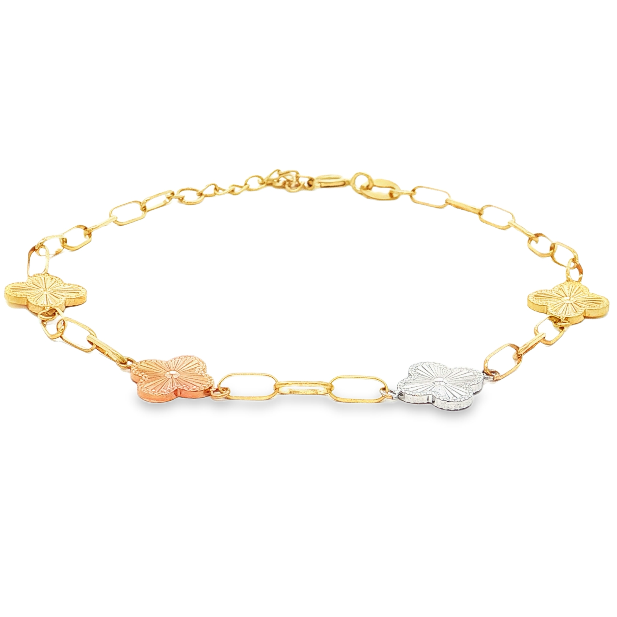 這款精緻的18k黃金鏈條手鍊,以其獨特的花朵圖案設計脫穎而出。不同顏色的花朵相互輝映,為整體造型增添了幾分活潑與時尚感。精湛的工藝和優質的材質保證了手鍊的耐用性和舒適度,無論是日常佩戴還是特殊場合,都能展現您的優雅品味。