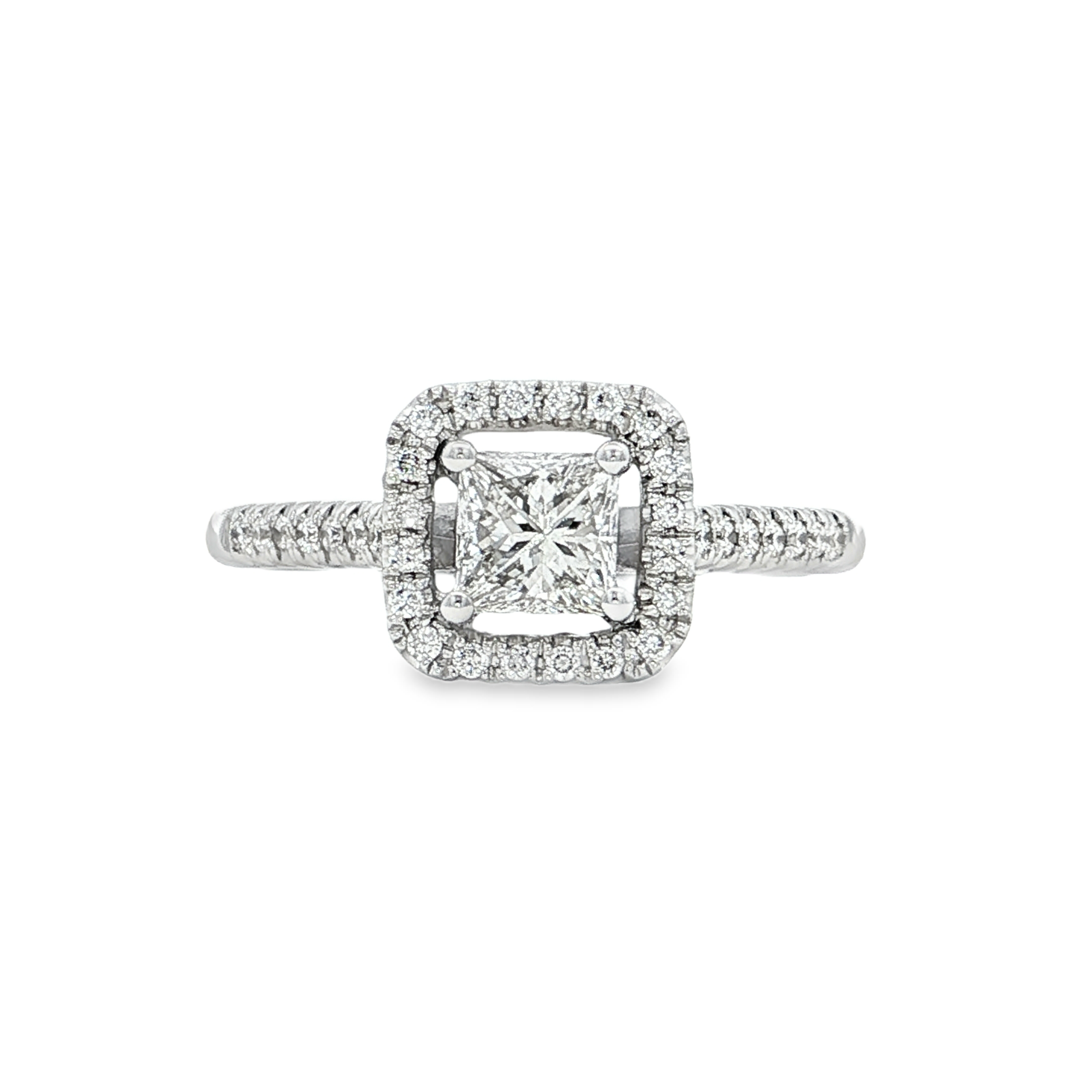 這款精緻的18K白金訂婚戒指,以公主方形切割的鑽石為主石,呈現出獨特的現代感和優雅氣質。鑽石閃耀奪目,切割精湛,完美捕捉光線,散發出令人難以抗拒的光芒。戒指採用高品質白金打造,設計簡潔大方,適合日常佩戴,見證永恆的愛情。
