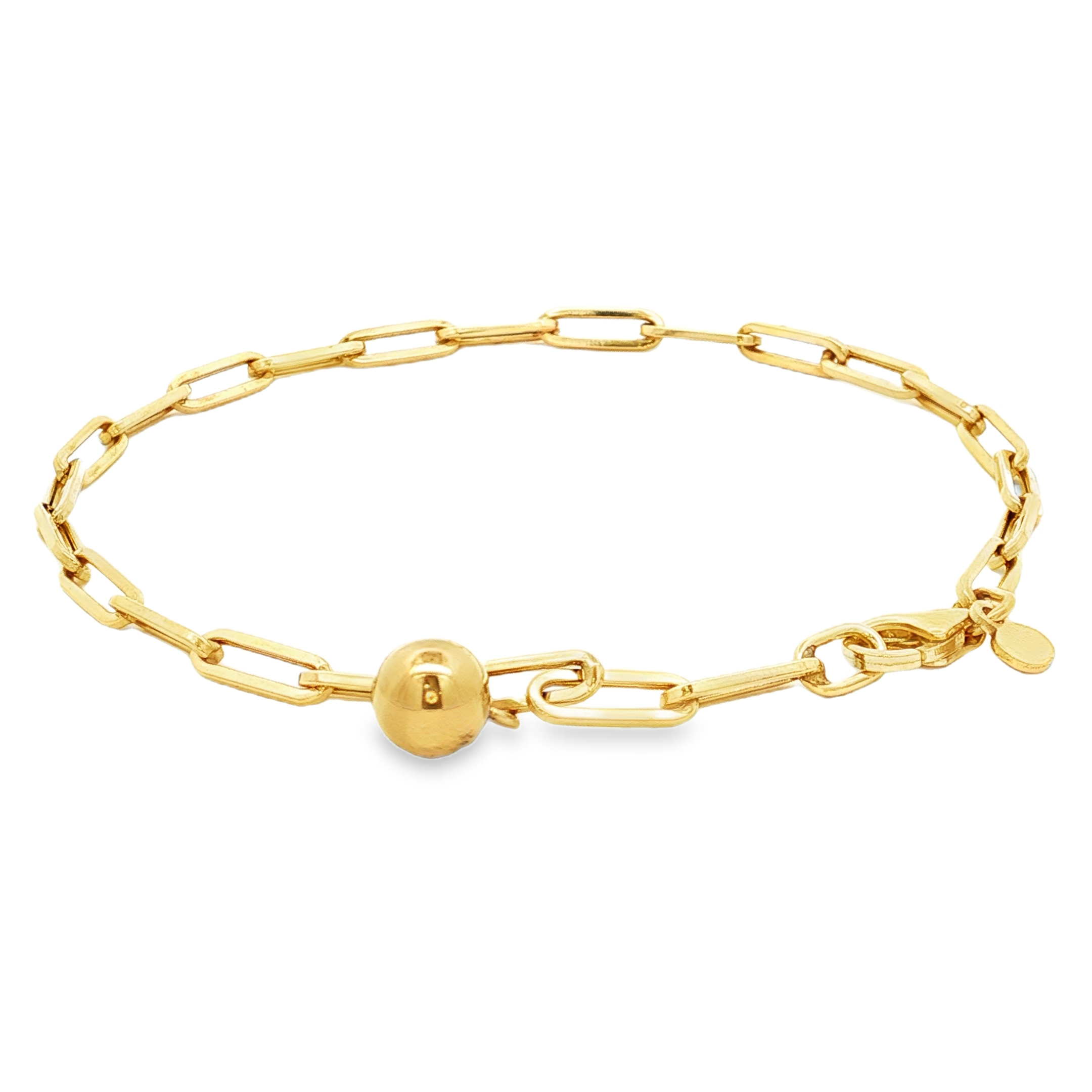 這款精緻的18K黃金鏈條手鍊,以簡約的長方形鏈節和一顆圓潤的金珠為特色,展現出現代而優雅的氣息。適合日常佩戴,為您的造型增添一抹低調奢華的光彩。