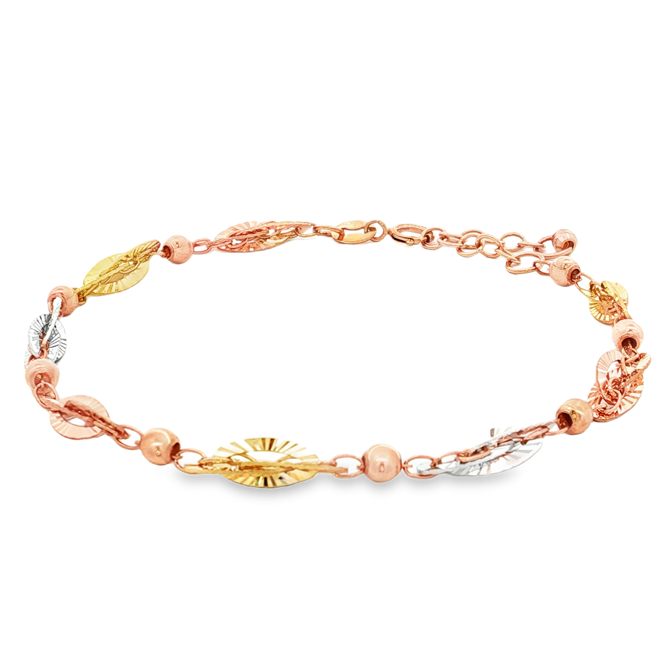 這款精緻的18k黃金手鍊,以其獨特的鏈條設計和精湛的工藝脫穎而出。手鍊採用多種金屬色調,增添了視覺層次感,使整體造型更加時尚。無論是日常佩戴還是特殊場合,都能展現您的優雅品味。