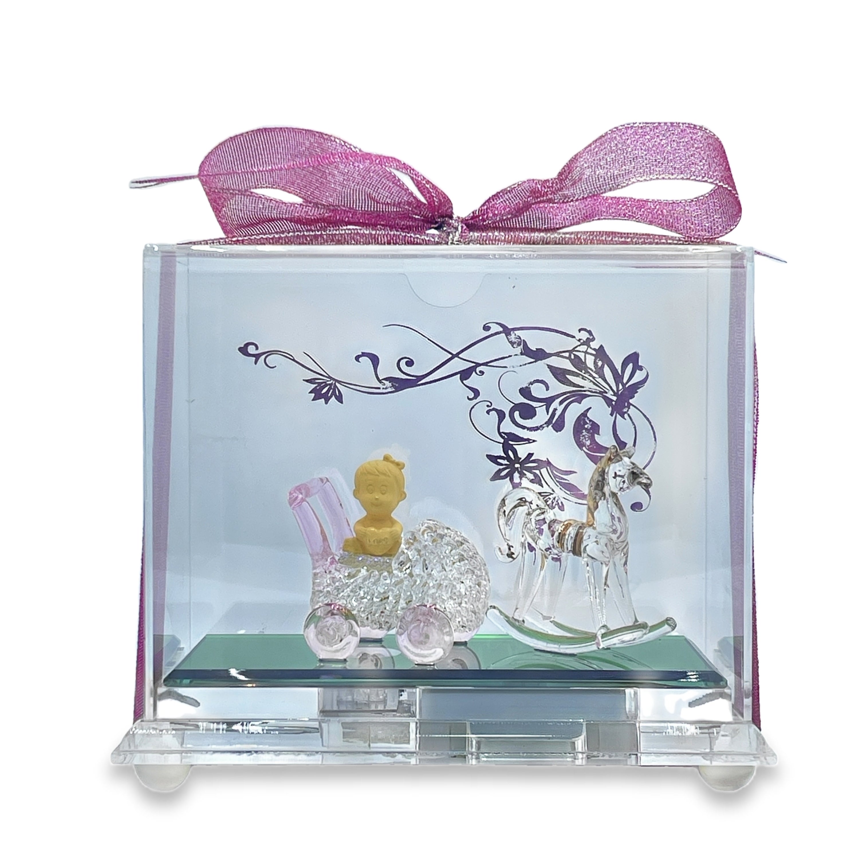 此精美擺件以透明材質製成,內部包含水晶嬰兒車和搖搖馬造型,頂部飾有粉色蝴蝶結,整體設計精巧細緻,適合作為禮品或居家裝飾。