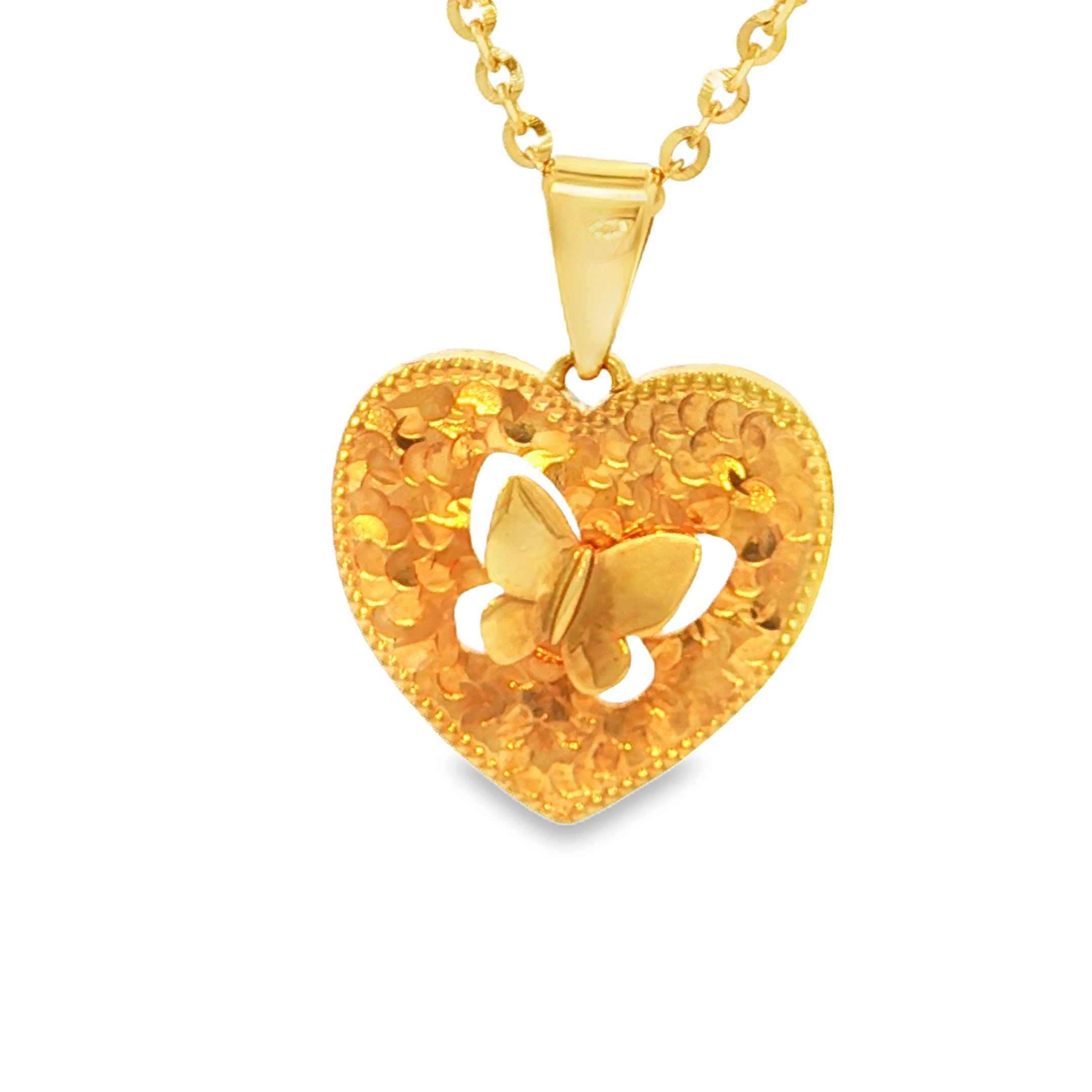 這款精緻的18K黃金吊墜,以心形設計為主體,鏤空雕琢出一隻翩翩起舞的蝴蝶,寓意著自由與美麗。黃金材質散發著溫暖的光澤,為佩戴者增添一份優雅氣質。適合日常佩戴,展現獨特品味。